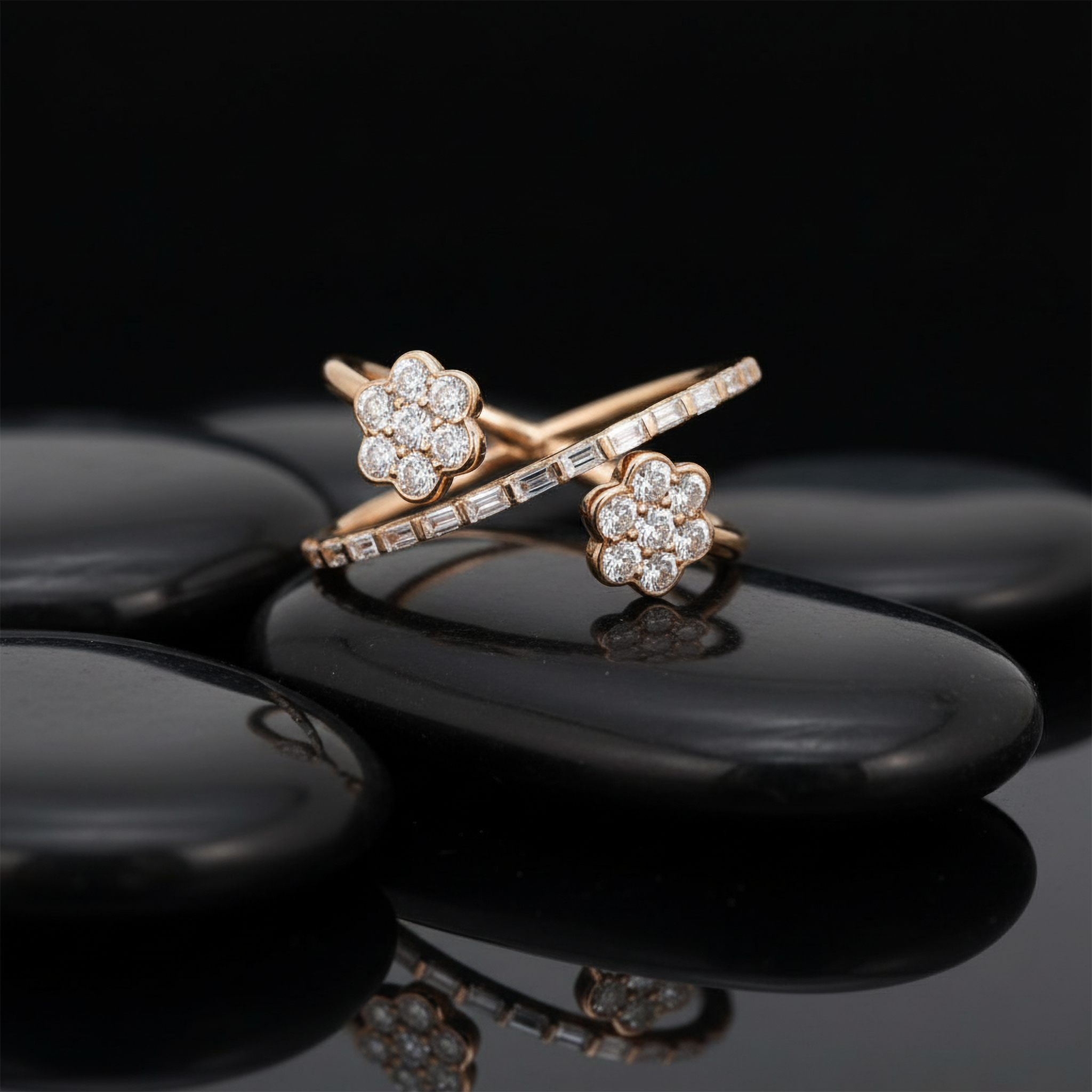 The Baguette Diamond 14K Yellow Gold Open Wrap Baguette Ring is a perfect blend of modern elegance and luxury. Crafted in 14K yellow and white gold, this ring features a sophisticated open wrap design adorned with 0.56 carats of FCD diamonds and 0.30 carats of baguette diamonds. The combination of brilliant round diamonds and sleek baguette cuts creates a stunning contrast that catches the light beautifully. A refined piece that adds timeless glamour to any collection.