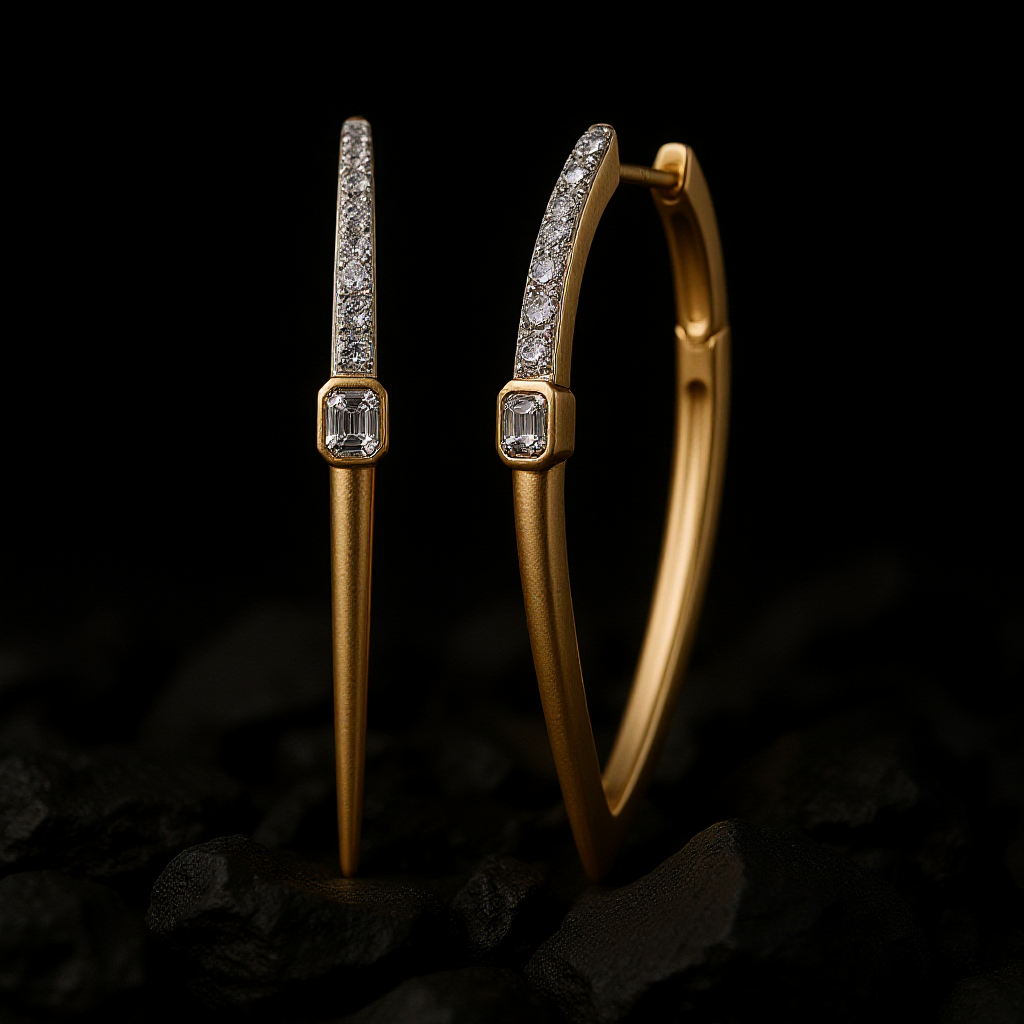 Sleek, modern, and elegantly edgy — these Emerald-Cut Diamond Spike Hoop Earrings redefine luxury with their minimalist yet striking silhouette. Crafted in 14K Yellow Gold (available in 18K upon request), each earring features a tapered spike design accentuated by a brilliant pavé diamond row, culminating in a single emerald-cut diamond centerpiece.