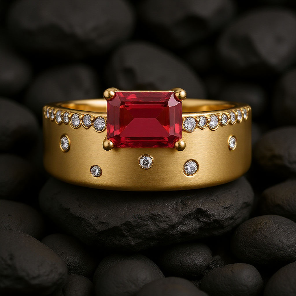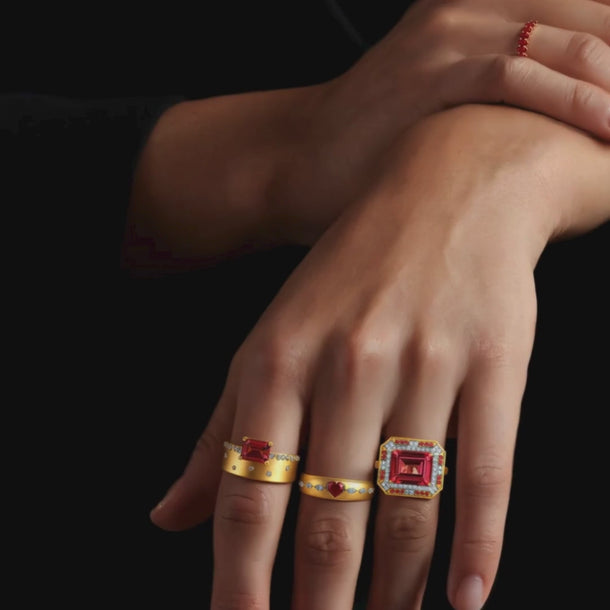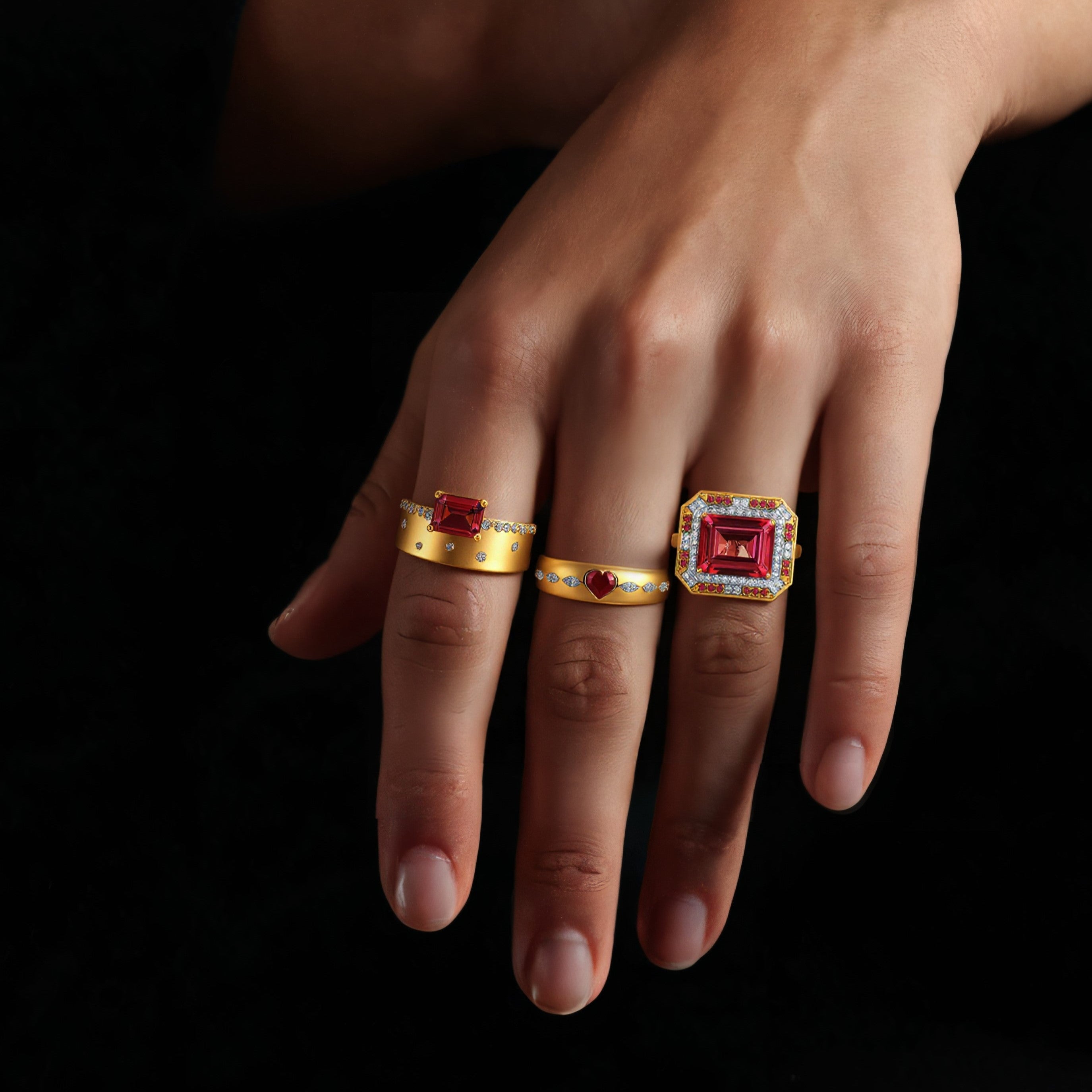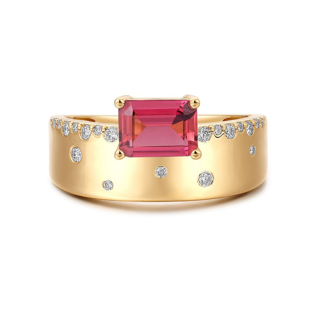 Modern elegance meets timeless artistry in the Emerald-Cut Pink Tourmaline and Diamond Statement Ring. Crafted in solid 14K yellow gold, this ring showcases a vivid emerald-cut pink tourmaline center stone — its vibrant hue exuding warmth and sophistication. Surrounding the centerpiece are scattered round-cut diamonds, artfully set across the wide band to create a sparkling constellation effect.