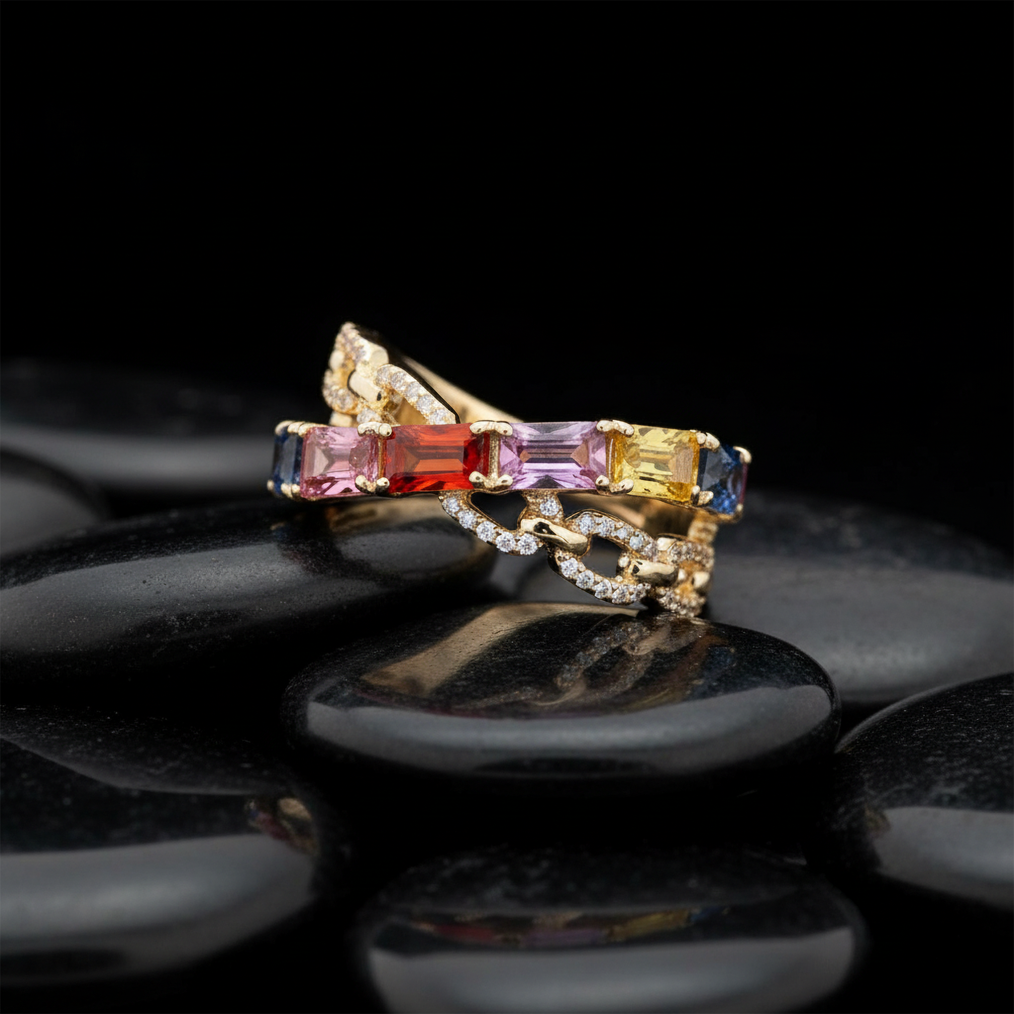 The Rainbow Baguette 14K White Gold Gemstone Chain Ring is a stunning fusion of vibrant color and dazzling brilliance. Set in 14K yellow gold, this ring features a beautiful wrap design adorned with natural diamonds (0.13 carats) and multi-sapphire stones (2.39 carats). Weighing 5 grams, it offers a perfect balance of elegance and wearability. The combination of rich sapphires and sparkling diamonds creates a captivating contrast, making this ring a striking statement piece for any occasion. A truly exceptional addition to your fine jewelry collection, it reflects a sophisticated and dynamic sense of style.