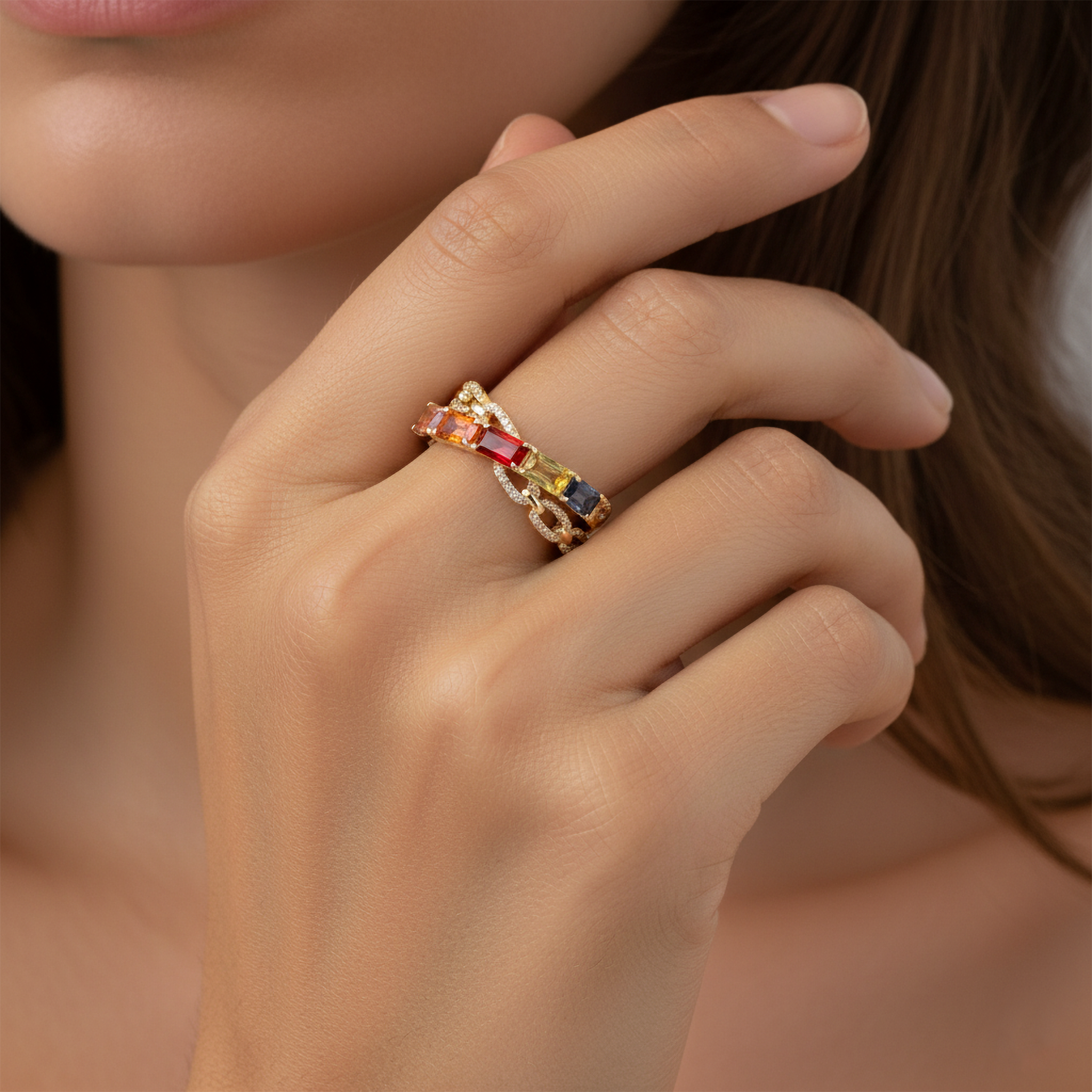 Rainbow Baguette 14K (or 18k upon request) White Gold Gemstone Chain Ring