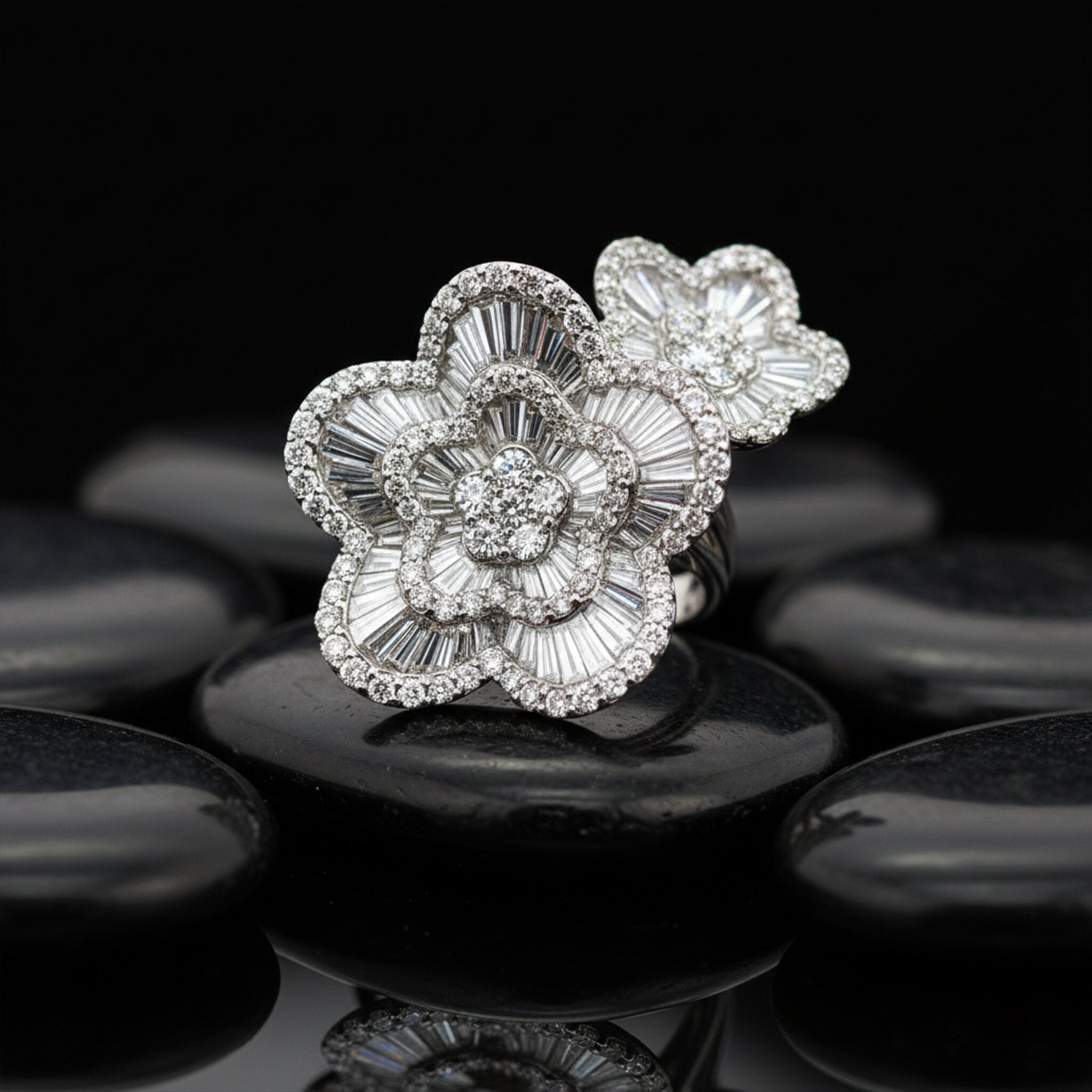 Diamond Double Flower 18K White Gold Cocktail Ring