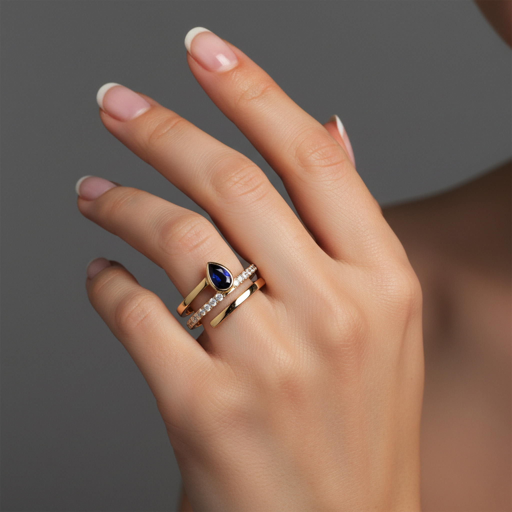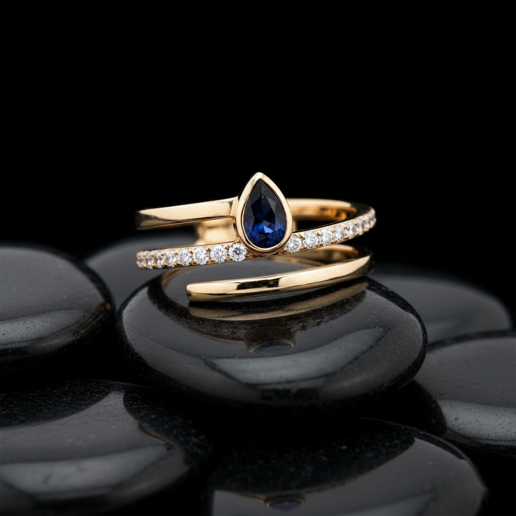 The Wrap Pear Sapphire Diamond 14K Yellow Gold Ring showcases a striking swirl design in 14K yellow gold. Natural diamonds and vibrant sapphires are beautifully intertwined, creating a mesmerizing contrast. The dynamic design adds modern sophistication to any look. A perfect statement piece for special occasions. Elevate your jewelry collection with this blend of elegance and color.