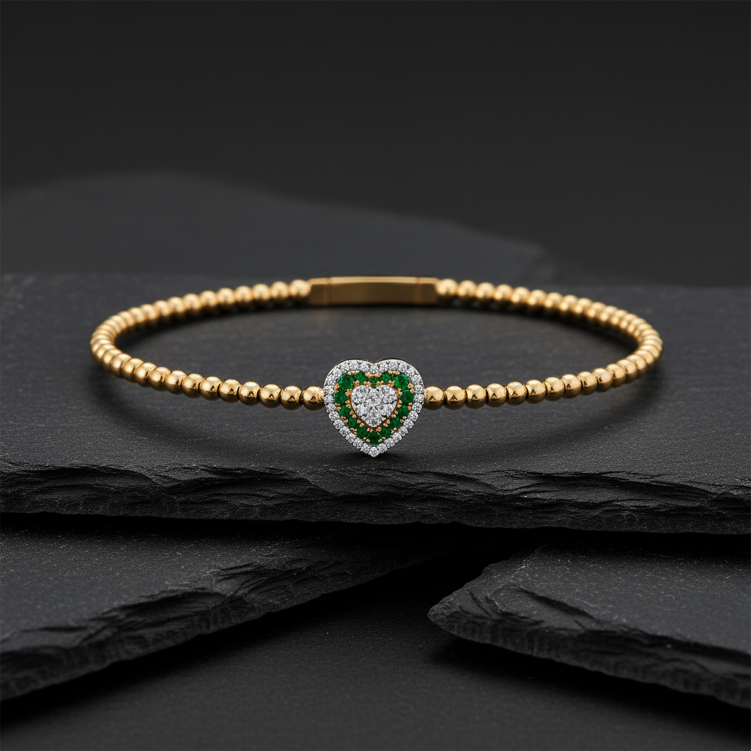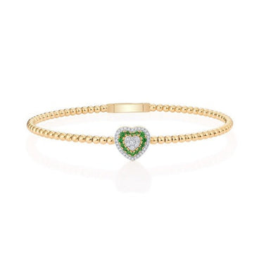 This elegant bangle is designed in 14K yellow gold, featuring a blend of blue sapphire, tsavorite, and diamonds. It measures 57MM*47MM with a flex of 2.5MM ball for added comfort. The bracelet weighs 5.38GR and is adorned with 0.15CT of full-cut diamonds and 0.15CT of tsavorite, making it a refined and radiant piece.