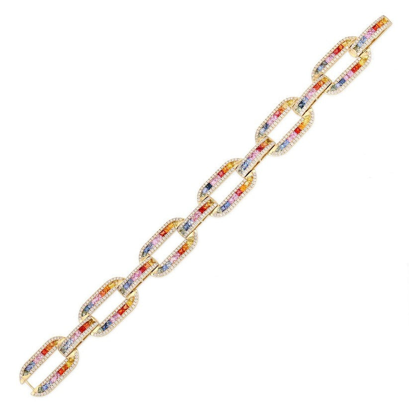 The Art Deco 14K Yellow Gold Diamond Link Bracelet is a striking tribute to timeless elegance and bold design. Crafted from 14K yellow gold and weighing an impressive 23.3 grams, this luxurious piece features 2.91 carats of natural diamonds and 10.74 carats of multi-colored sapphires. The intricate link design, inspired by the geometric beauty of the Art Deco era, showcases the vibrant sapphires and sparkling diamonds in perfect harmony. A true statement piece, this bracelet is ideal for those who appreciate vintage-inspired glamour with a modern touch.