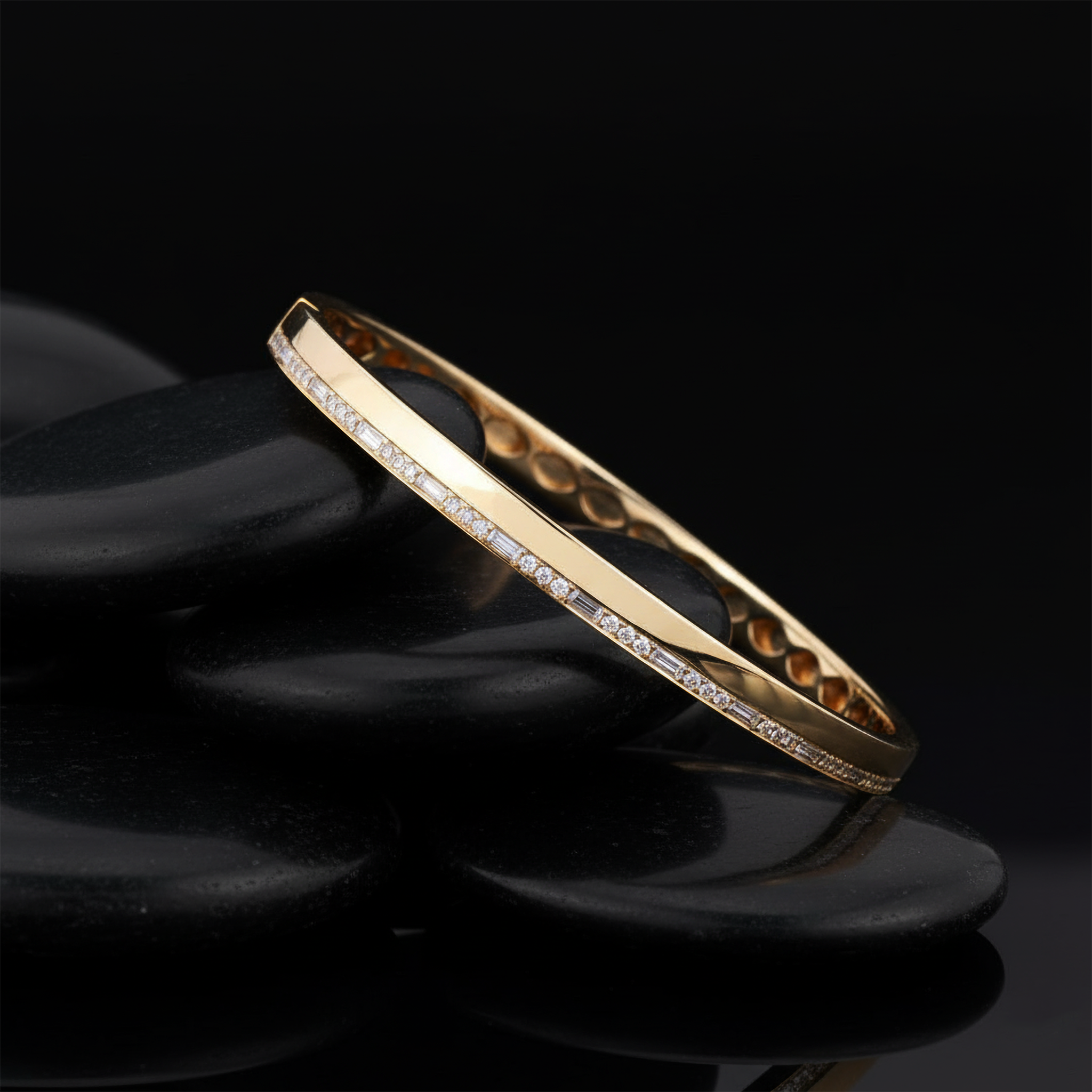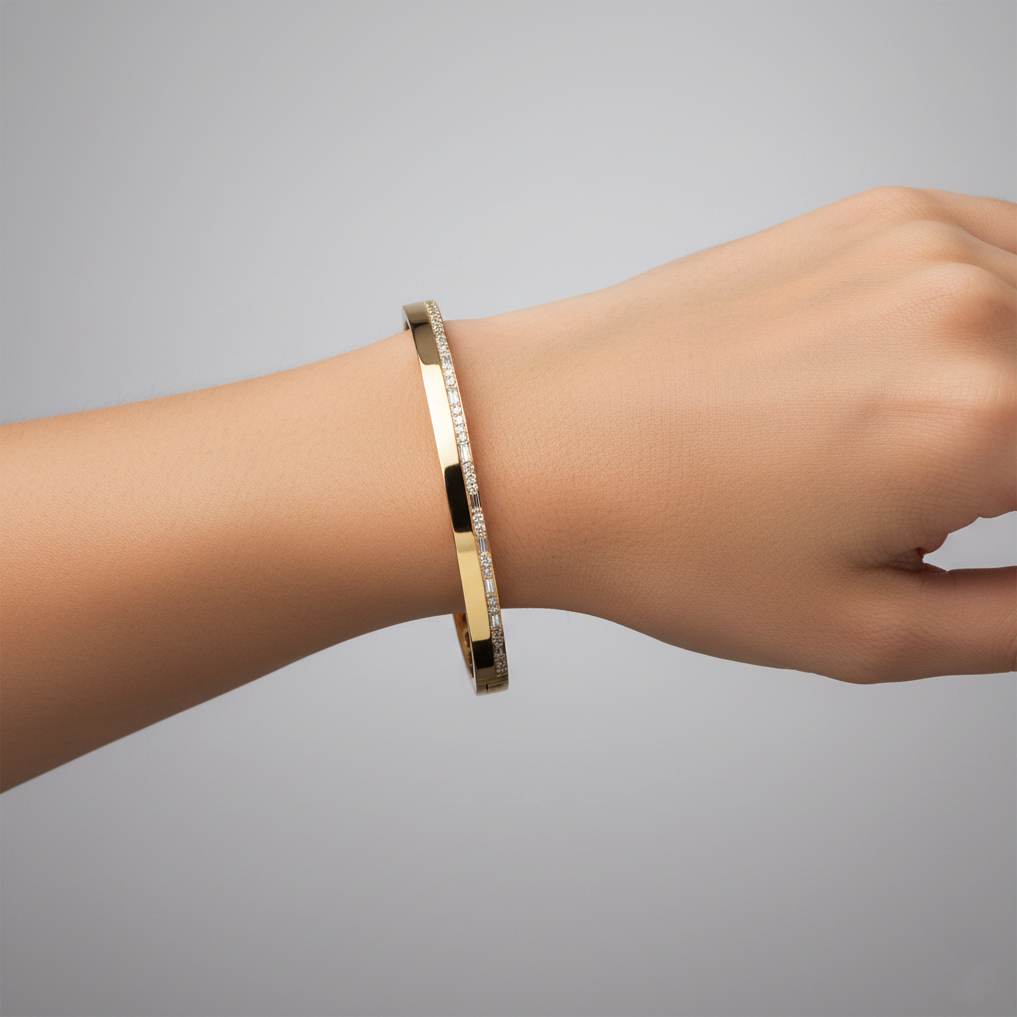 The Cosmic Grace 14K Yellow Gold Diamond Bangle Bracelet features 0.29 carats of natural diamonds, with baguette diamonds totaling 0.28 carats, set in luxurious 14K gold. Available in both yellow and rose gold, this bracelet combines sophisticated design with radiant sparkle. The sleek bangle design is perfect for adding a touch of grace and elegance to any outfit, making it an ideal choice for both everyday wear and special occasions.