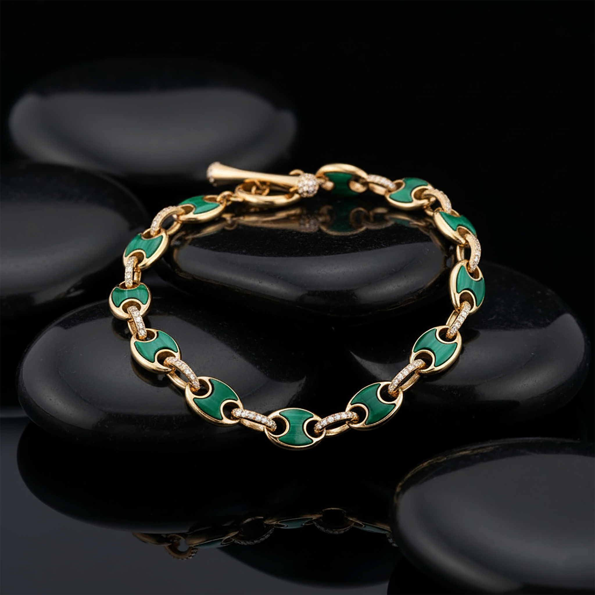 The Diamond Blossom 14K Yellow Gold Diamond Link Bracelet is an exquisite fusion of elegance and nature-inspired beauty. Crafted from 14K yellow gold, this stunning bracelet features 0.96 carats of natural diamonds, complemented by 8.28 carats of vibrant malachite. The interplay of the sparkling diamonds and the rich green malachite creates a dynamic and eye-catching design, evoking the beauty of a blooming flower. Perfect for adding a touch of refined luxury to any look, this bracelet is a true statement piece.