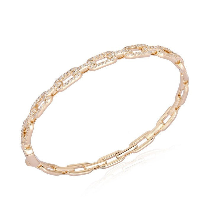 The Diamond Pulse 14K Yellow Gold Bangle Bracelet radiates timeless elegance, featuring 14K gold available in yellow, rose, or white finishes. Adorned with natural diamonds totaling 0.77 carats, this bracelet creates a captivating sparkle with every movement. Its sleek and modern design makes it a refined choice for any occasion, blending luxury with versatility to enhance your jewelry collection.