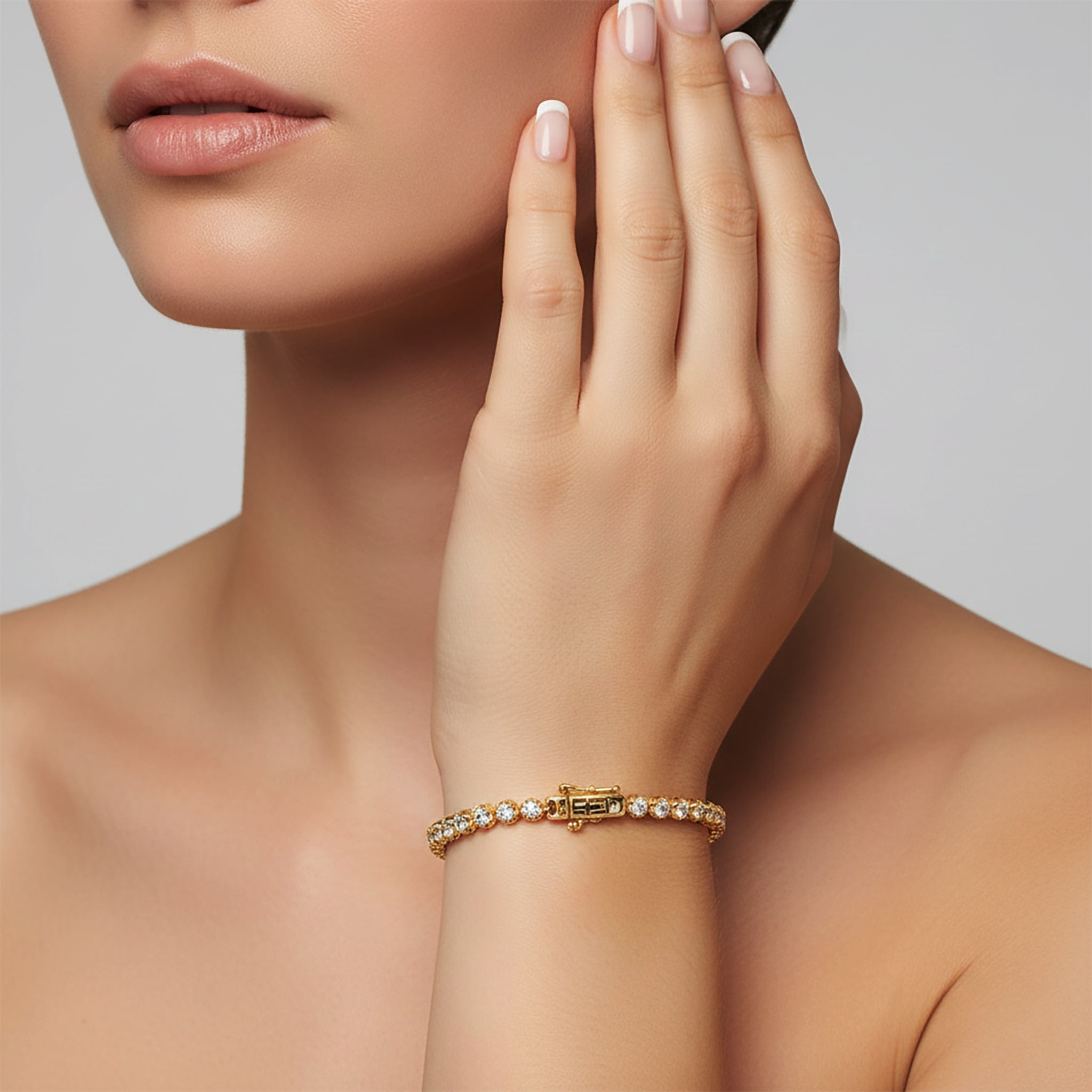 The Elite Essence 14K Yellow Gold Diamond Tennis Bracelet is a sophisticated piece designed with precision and elegance. Set in 18K white gold, it features sparkling diamonds that highlight the bracelet's luxurious and timeless appeal. The bracelet’s flawless design ensures it complements both casual and formal attire, perfect for special occasions or everyday elegance. The diamonds are carefully selected for their quality, making this bracelet a true statement piece. Ideal for those who appreciate refined, high-quality jewelry.