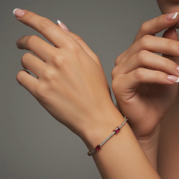 Elevate your elegance with this stunning tennis bracelet, showcasing a harmonious blend of rich rubies and sparkling white diamonds. Crafted in 14k gold, this exquisite piece adds a timeless touch of luxury to any ensemble.