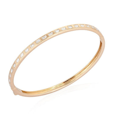 The Golden Baguette Diamond 14K Yellow Gold Bangle Bracelet is a refined piece set in 14K yellow or rose gold. It features baguette diamonds with a total weight of 1.10ct, adding a sophisticated touch to your look. This elegant bangle combines timeless design with luxurious sparkle. Perfect for adding a vintage-inspired glow to any ensemble. Its sleek structure and radiant diamonds ensure it remains a classic favorite.