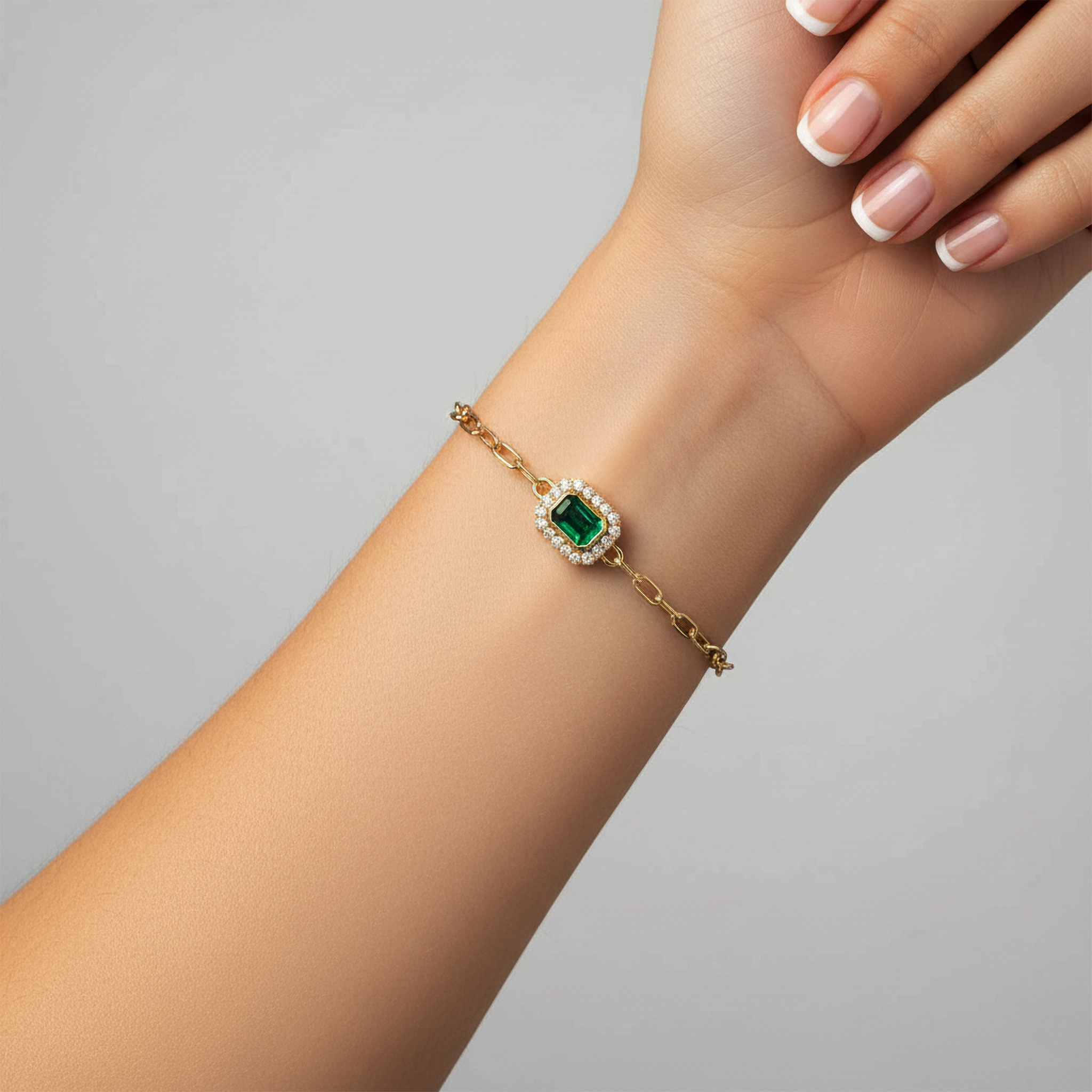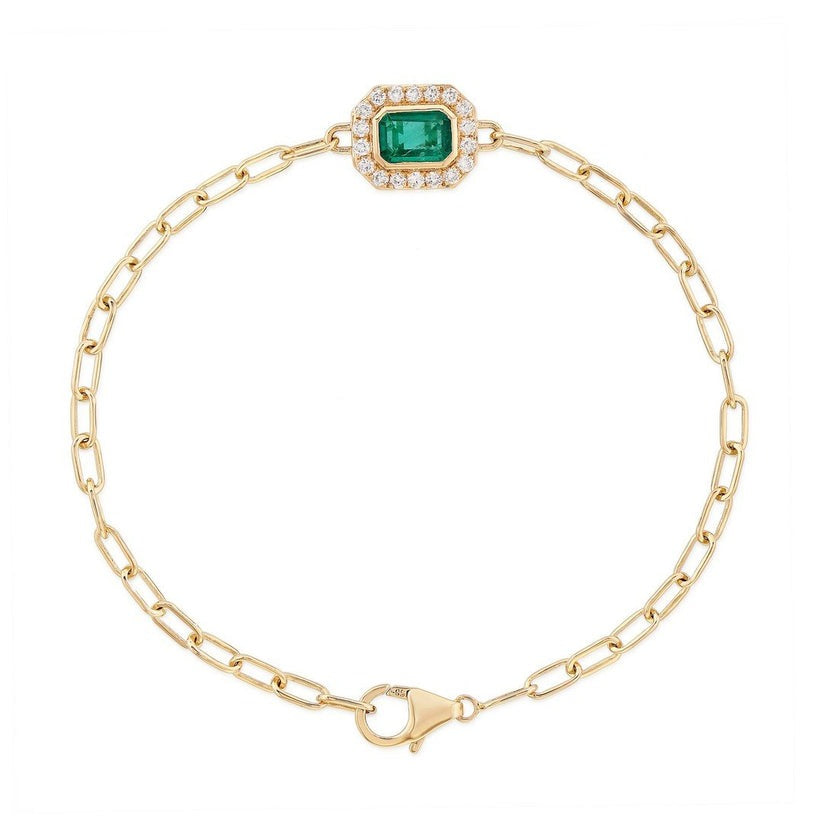 Green Halo 14K (or 18k upon request) Gold Emerald Centre Paperclip Chain Bracelet