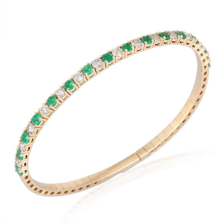 This exquisite 14K yellow gold bangle combines the vibrant beauty of emeralds with the timeless elegance of natural diamonds. Featuring a total diamond carat weight of 1.51CT and 1.57CT of emeralds, this bracelet radiates sophistication and luxury. Its refined design ensures it’s the perfect addition to any collection, offering both stunning color contrast and brilliant sparkle.