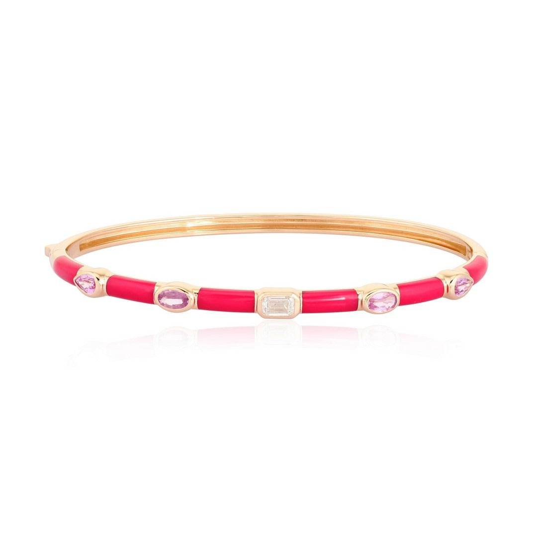 The Harmony Bangle 14K Yellow Gold Diamond Bracelet combines 0.31 carats of natural fancy diamonds with 0.85 carats of vibrant pink sapphires, set in luxurious 14K yellow gold. Weighing 8.80 grams, this elegant piece is further enhanced with exquisite hand-applied enamel, offering a unique blend of color and sparkle. Its harmonious design makes it a perfect choice for both everyday wear and special occasions, adding a sophisticated touch to any look.