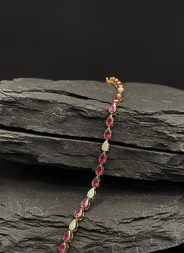 The Pear Shaped Evil Eye 14K Yellow Gold Ain Hara Bracelet blends elegance with protection. Adorned with natural diamonds and red rubies, this striking piece is designed to shield you from negative energies while adding a touch of sophistication to your look.