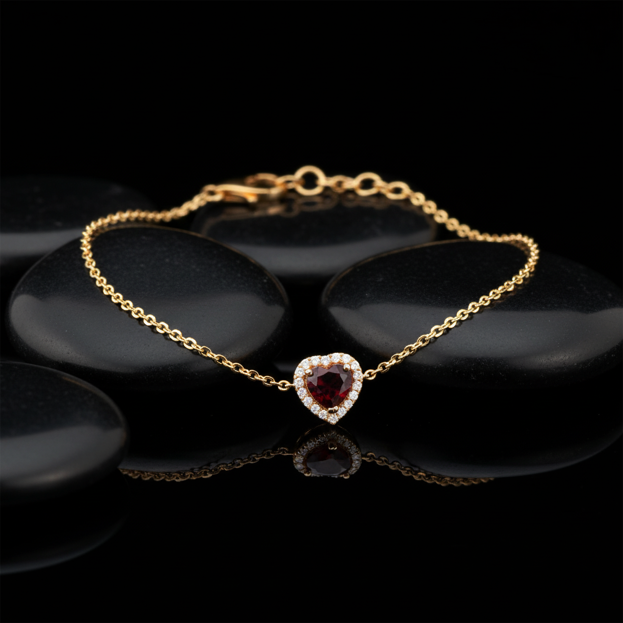 Crafted from 14K yellow gold, this stunning bracelet features natural diamonds (0.08CT) paired with deep red garnet stones (0.56CT). The delicate sparkle of the diamonds perfectly complements the rich vibrance of the garnets, creating a celestial charm that radiates timeless elegance. An enchanting piece to elevate any look.