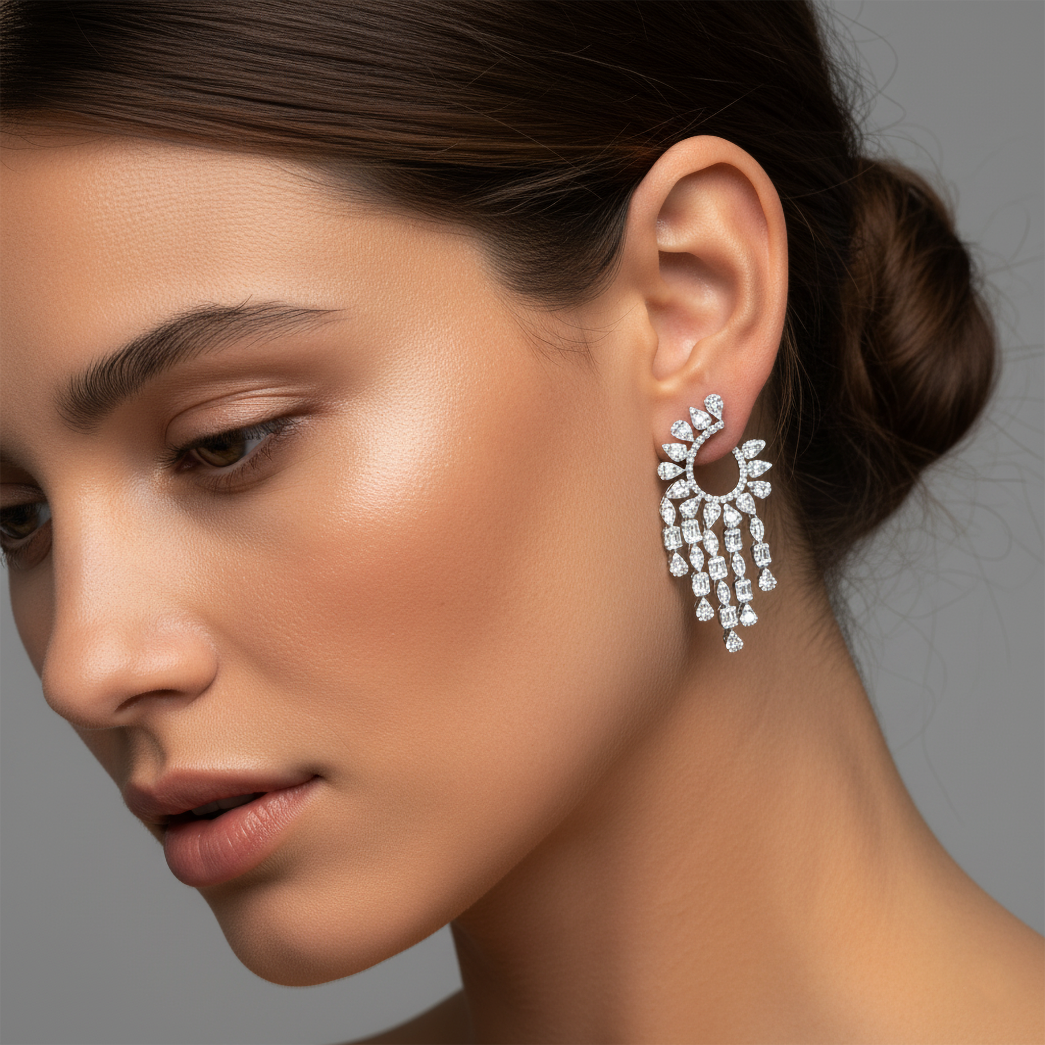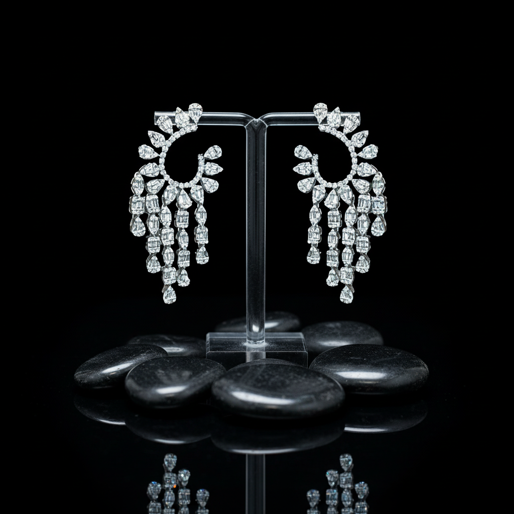 These breathtaking Chandelier Cluster Statement Earrings are the epitome of luxury and sparkle. Crafted from lustrous 18K white gold, each earring features an intricate open hoop silhouette crowned with alternating pear and marquise-cut diamonds, creating a floral-inspired cluster. From the base, multiple cascading diamond strands flow in a dramatic waterfall of brilliance, capturing the light at every angle. The unique blend of clustered and drop settings offers maximum sparkle and movement, making these earrings a true showstopper for high-end events or luxury bridal looks.
