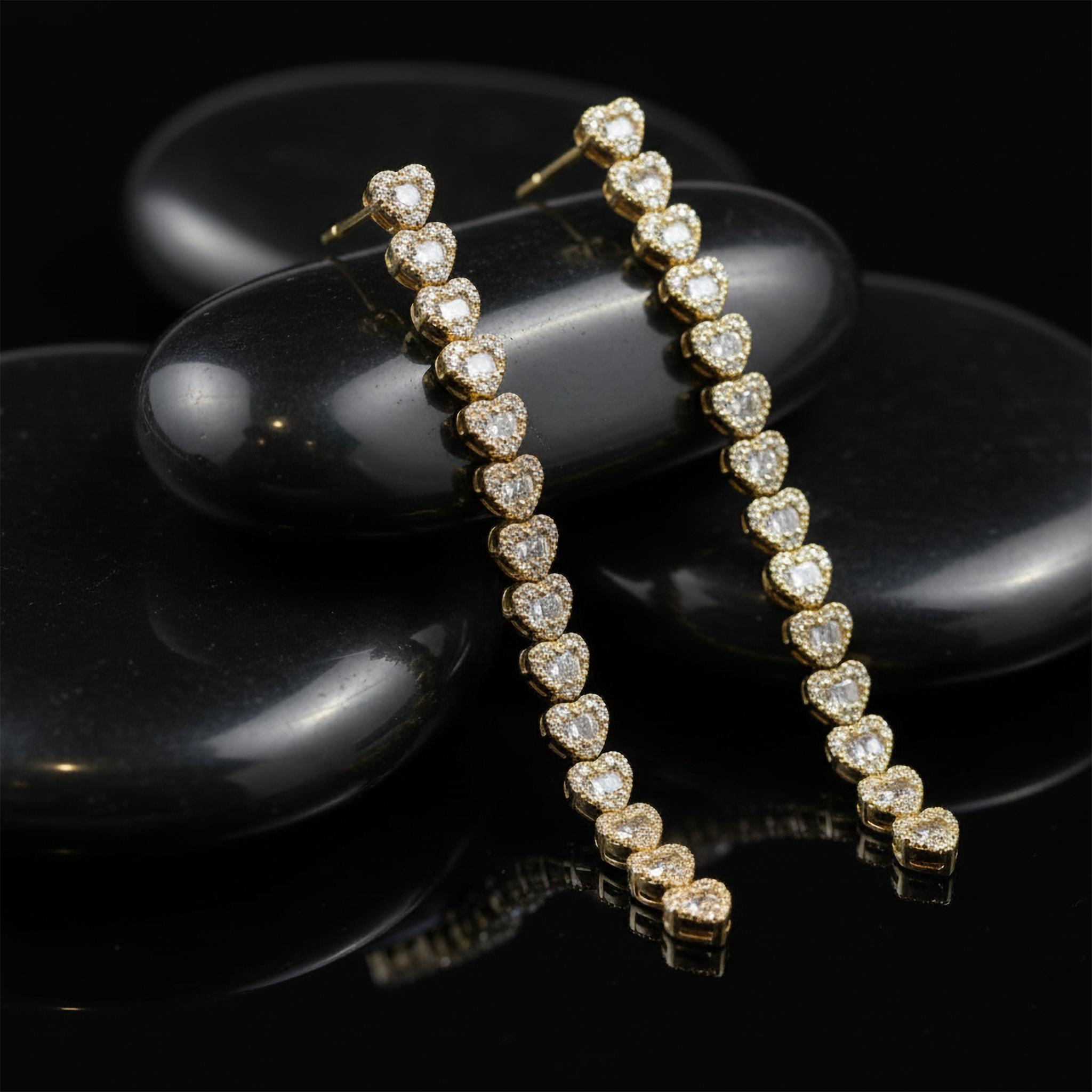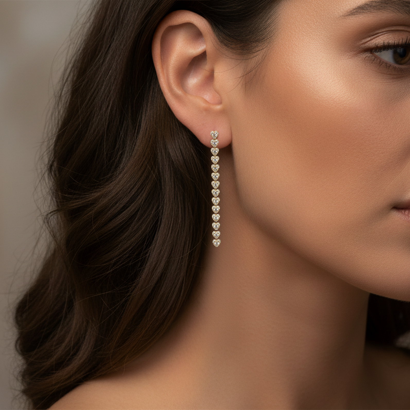 Elegant and romantic, these Heart Shaped 18K Yellow Gold Diamond Line Drop Earrings are a perfect expression of timeless love. Each earring features a graceful line of sparkling diamonds leading to a delicately crafted heart design, exuding sophistication and charm. Expertly set in radiant 18K yellow gold, they offer a brilliant contrast that enhances the diamonds’ fire and brilliance. Ideal for special occasions or as a heartfelt gift, these earrings bring both luxury and sentiment to any jewelry collection.