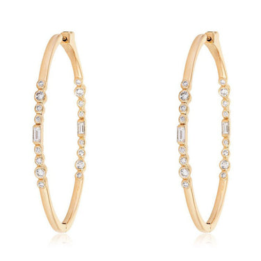 Indulge in the timeless beauty of the Golden Passion 14K Yellow Gold Hoops Diamond Earrings. Crafted from radiant 14K yellow gold, these exquisite hoops are adorned with a blend of brilliant full-cut diamonds and shimmering baguette diamonds. The design captures the perfect balance of classic elegance and modern sophistication, making them the ideal statement piece for any occasion. With their stunning sparkle and sleek form, these earrings are a true reflection of luxury and grace.