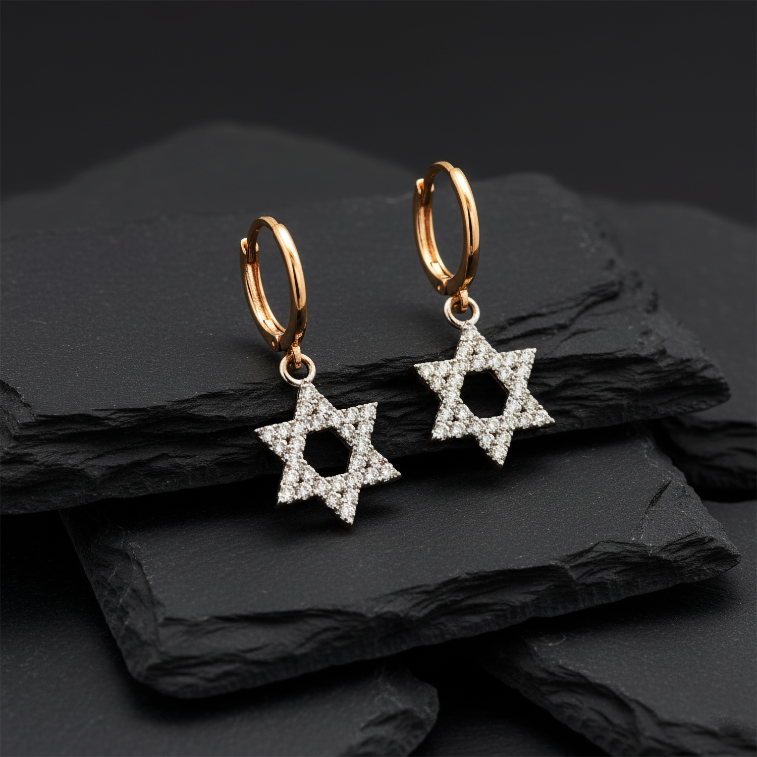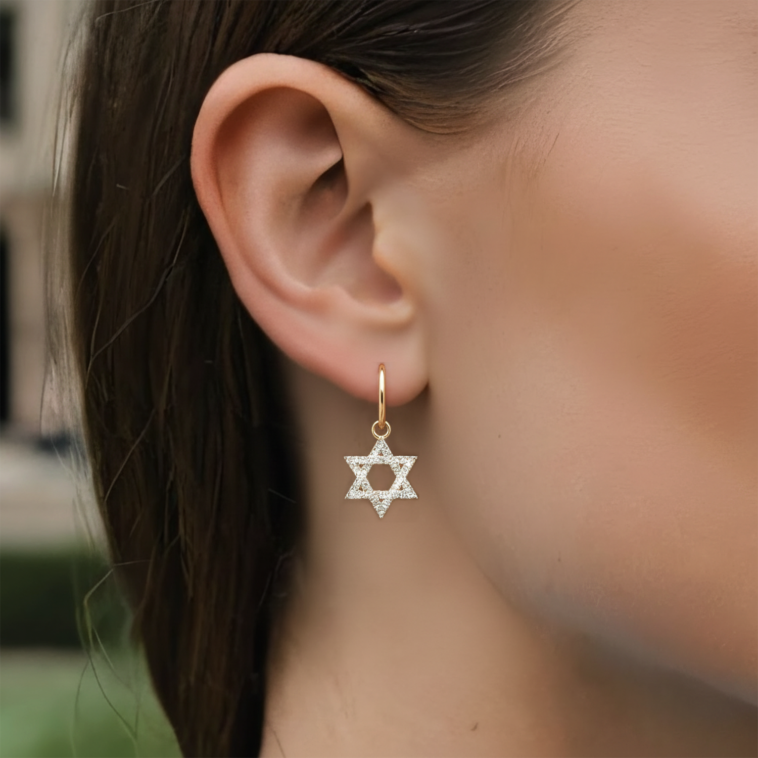Symbolizing faith and style, these Star of David earrings are adorned with natural diamonds, radiating elegance. Crafted in 14k gold, they offer a timeless sparkle perfect for both everyday wear and special occasions.
