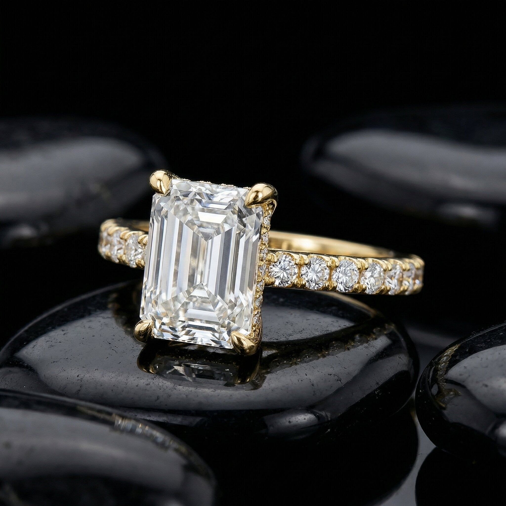 Ring features a stunning hidden halo setting that adds a unique, elegant touch to its timeless design. Showcasing an emerald-cut, conflict-free diamond with exceptional clarity and color, this ring is perfect for a memorable proposal or special occasion. Crafted in yellow gold, it offers both luxury and sophistication in one breathtaking piece.