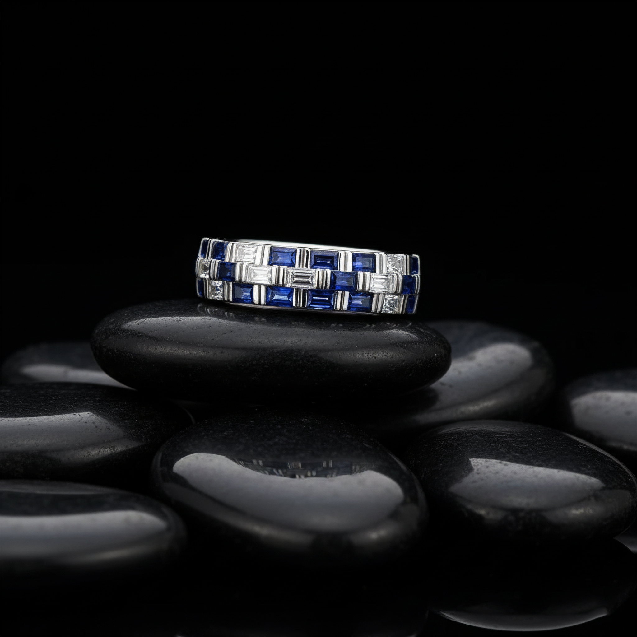 The Baguette Blue Sapphire Diamond 14K White Gold Band Ring is a timeless piece crafted in radiant 14K white gold. Featuring a harmonious arrangement of natural diamonds and striking blue sapphire baguettes, this elegant band epitomizes sophistication and grace. With a luxurious weight and expertly cut stones, this ring exudes brilliance and charm, making it a perfect symbol of eternal love and style.