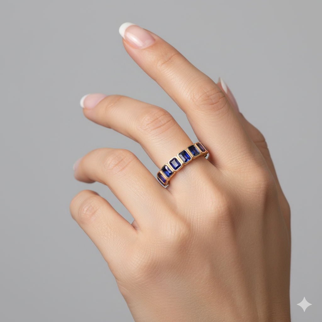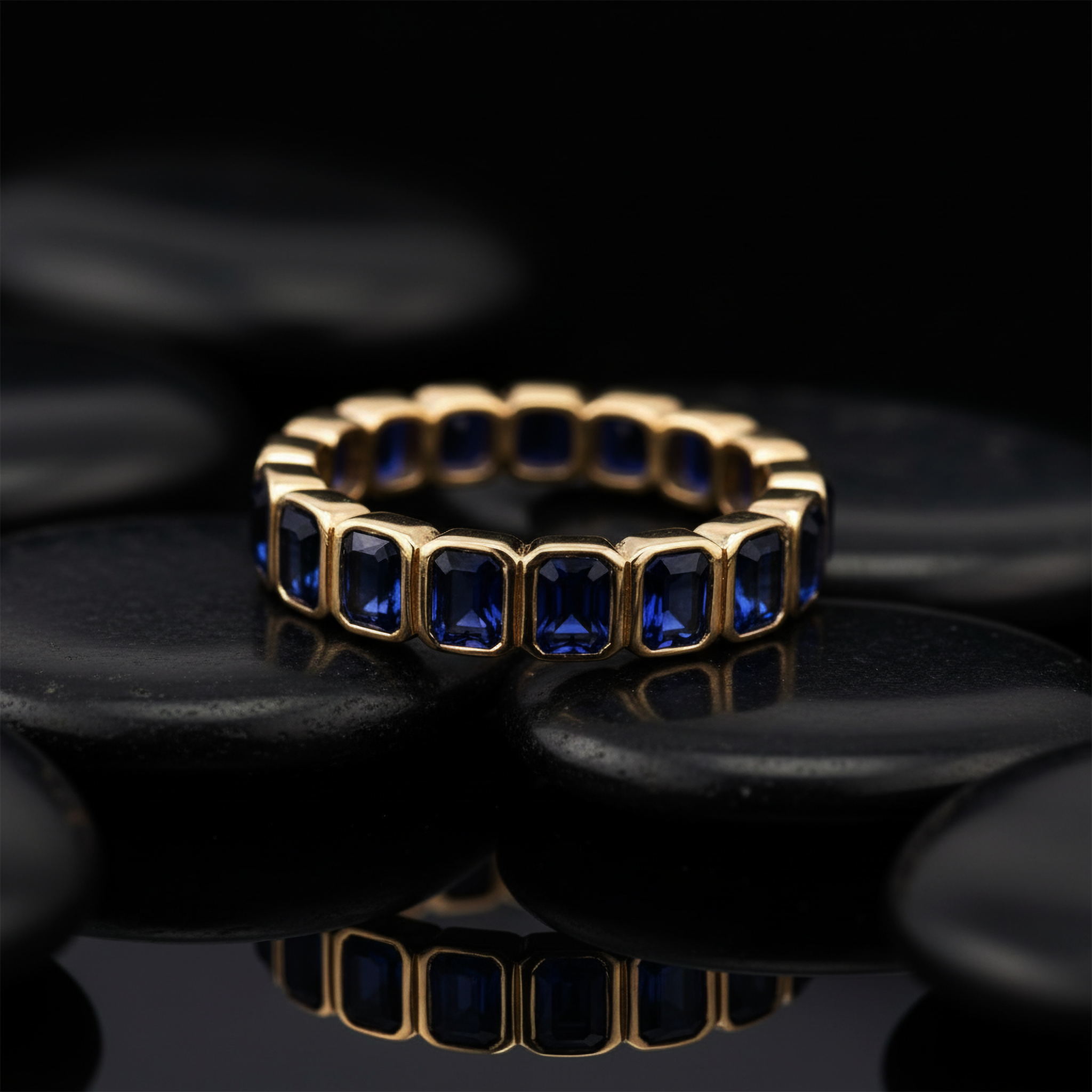 Band Ring 14K (or 18k upon request) Yellow Gold Emerald Cut Blue Sapphire Ring