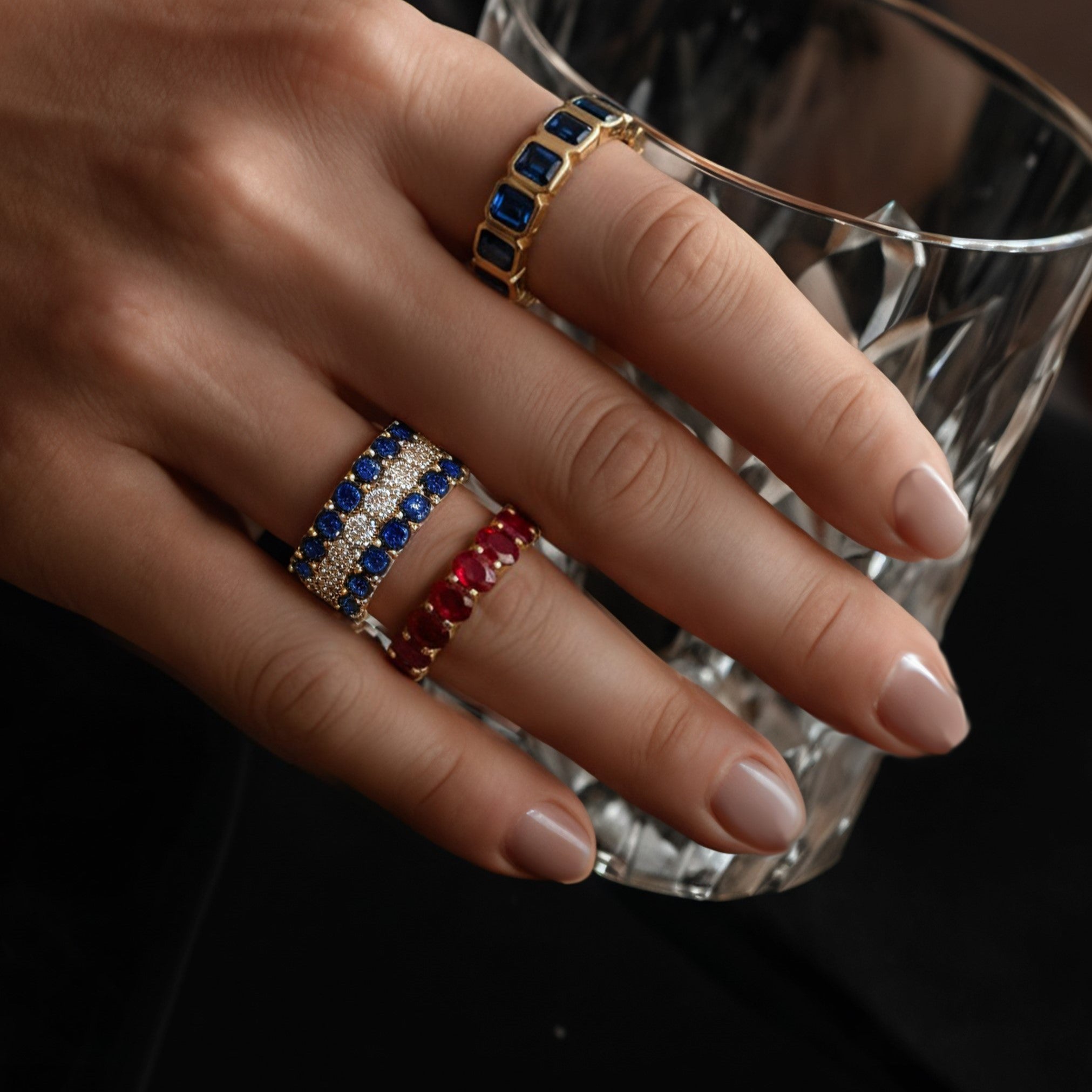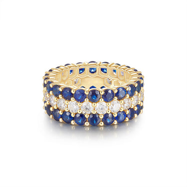 A masterpiece of elegance and craftsmanship, this Blue Sapphire & Diamond Eternity Band radiates regal beauty with its seamless blend of deep blue sapphires and brilliant white diamonds. Crafted in solid 14K yellow gold, this bold yet refined ring features three rows of precision-cut gemstones — the outer rows adorned with vivid royal blue sapphires, framing a center band of brilliant round diamonds.