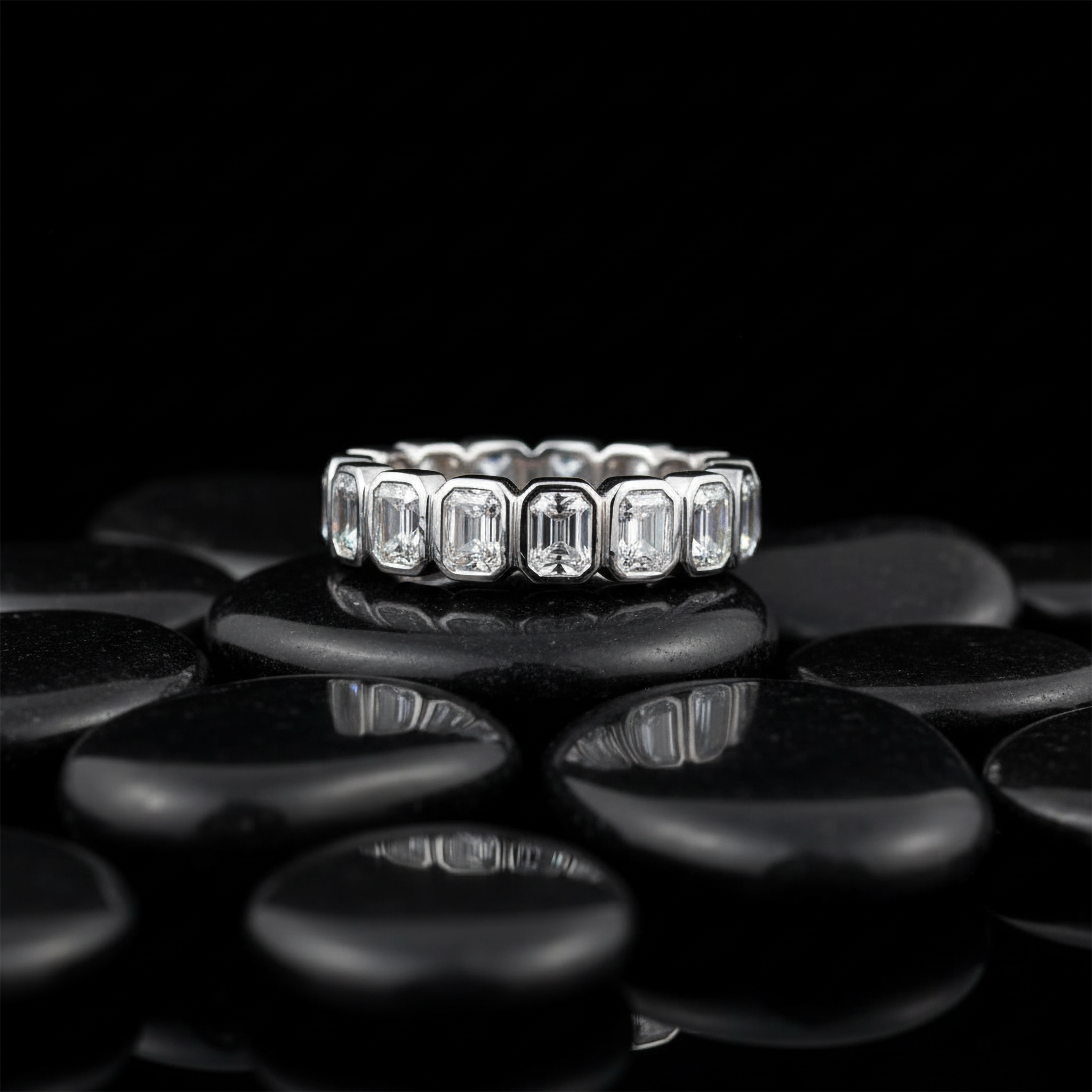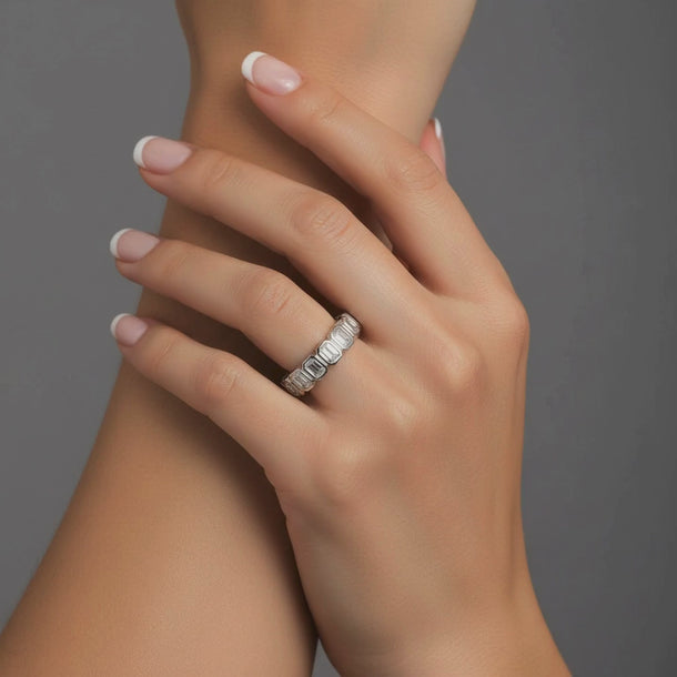 The Bold Band 14K White Gold Emerald Cut Diamond Bezel Style Ring exudes elegance and brilliance. Meticulously crafted from 18K white gold, this stunning ring is adorned with 15 natural diamonds, totaling an impressive 3.84 carats. Each diamond is of FG color and VS clarity, ensuring exceptional sparkle and quality. This timeless piece is perfect for celebrating love, milestones, or simply adding a touch of sophistication to your collection.
