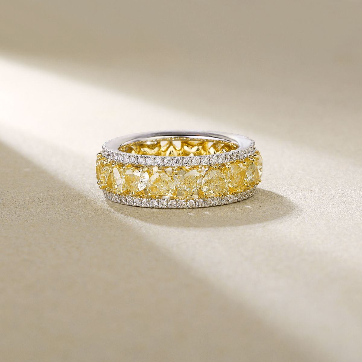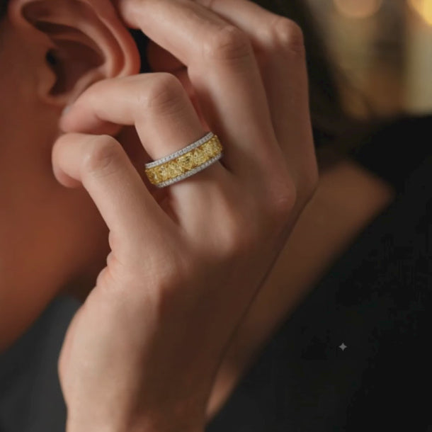 A radiant symbol of sophistication and joy, the Canary Yellow Diamond Double Row Eternity Band combines bold color with timeless craftsmanship. Set in dual-tone 18K white and yellow gold, this exquisite design showcases a central row of fancy yellow cushion-cut diamonds, each glowing with golden warmth and fire.
