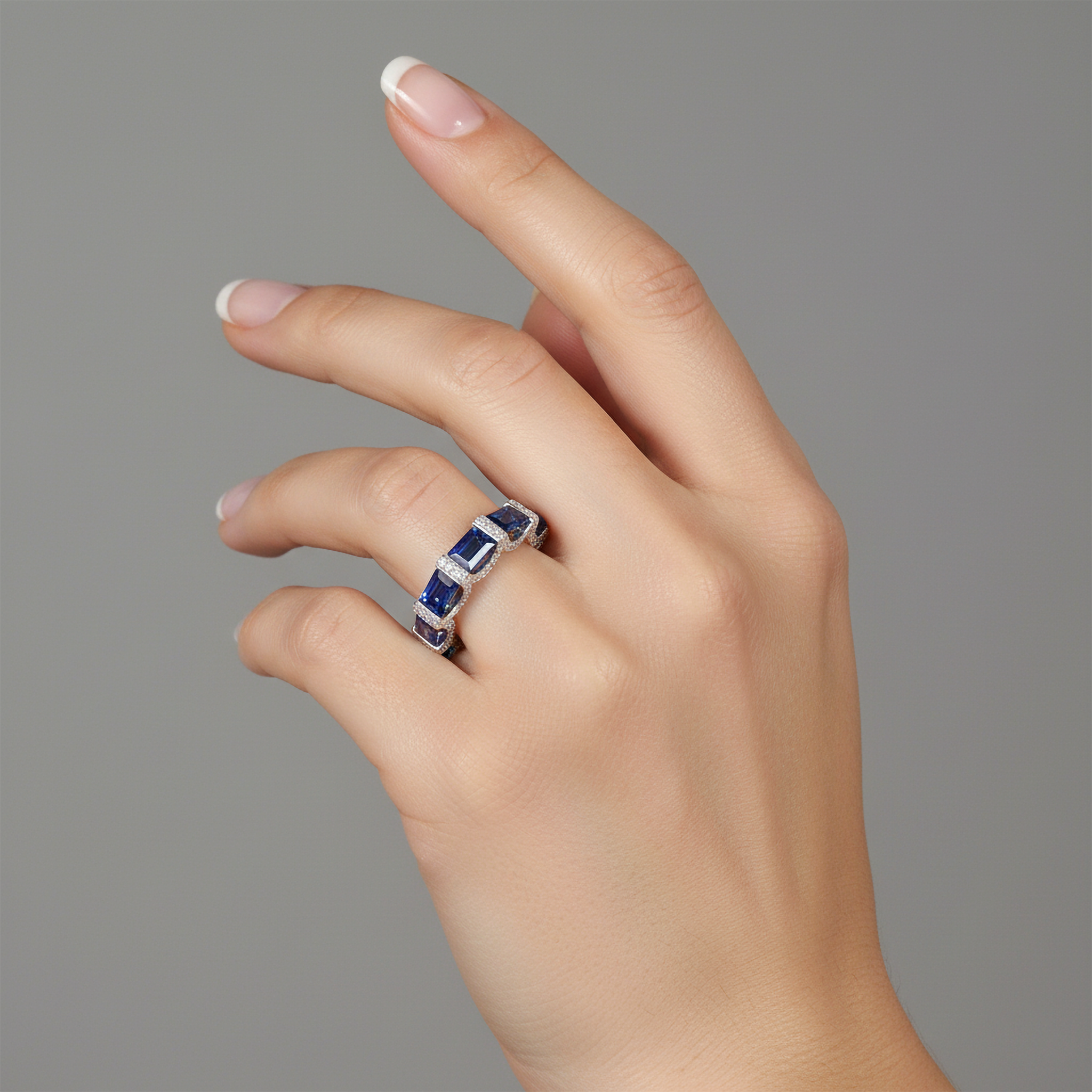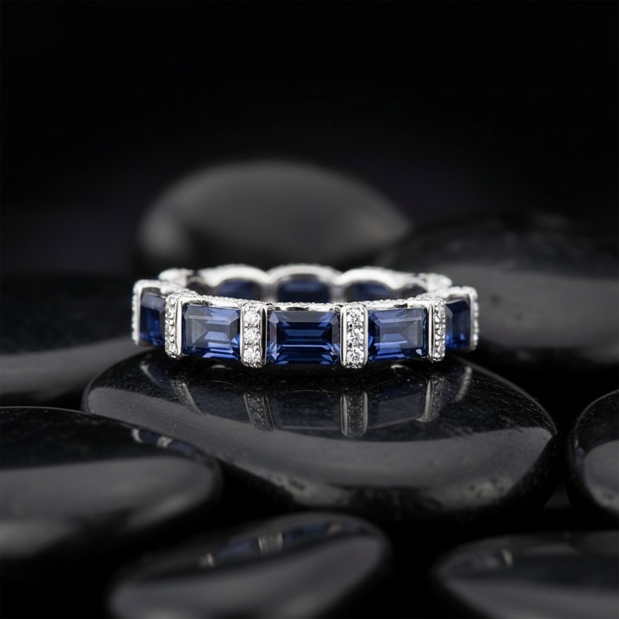 This Contemporary Sapphire Band in 14K White Gold showcases a sleek row of baguette-cut blue sapphires, exuding modern elegance with clean lines and refined simplicity. The crisp white gold setting enhances the deep sapphire hue, creating a sophisticated balance of brilliance and color. Perfect as a wedding band, stacking ring, or a chic standalone piece, this design embodies timeless style with a contemporary edge.