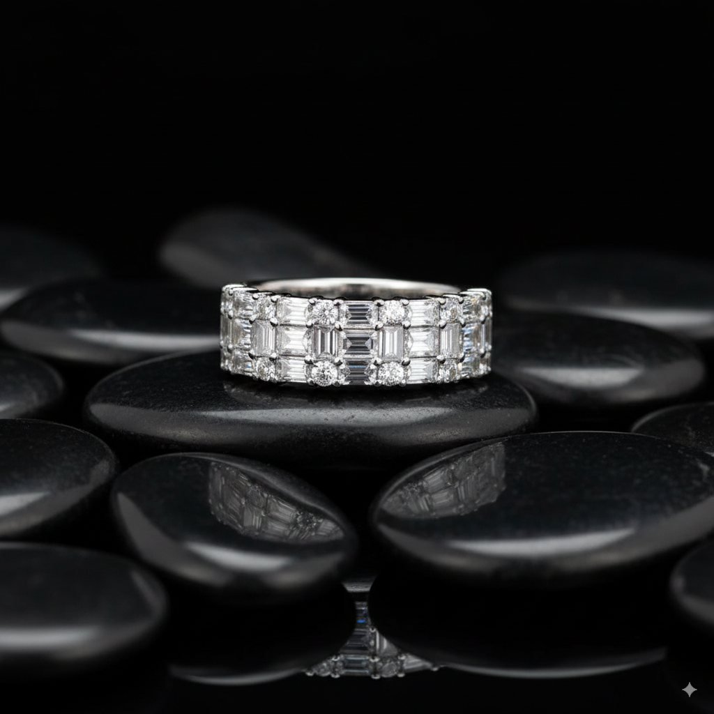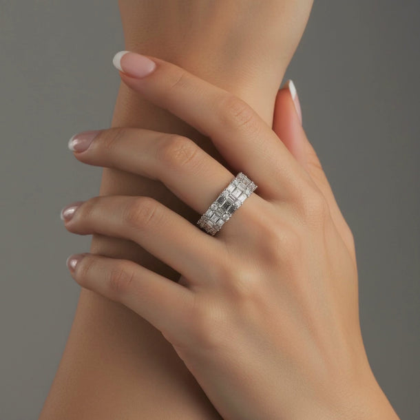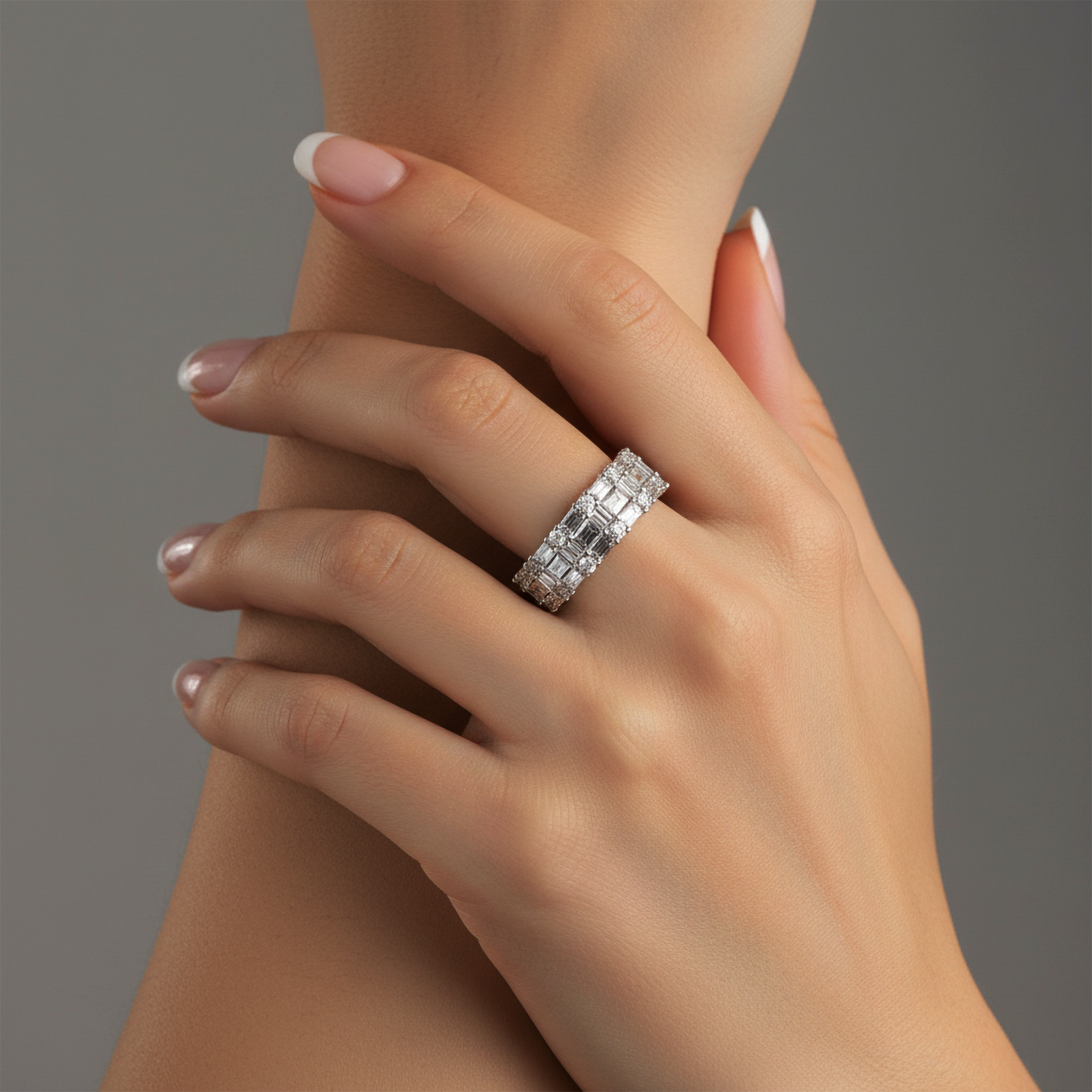 The Radiant Crystal Baguette Diamond Eternity Ring exudes timeless sophistication and unmatched brilliance. Crafted in luxurious 14K white gold, this exquisite piece features natural diamonds and dazzling baguette diamonds, with a total weight of 2.08 carats (D0.45CT, BGT1.63 CT). Its elegant design is perfect for celebrating life’s most cherished moments.