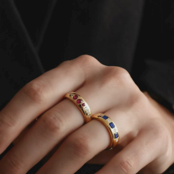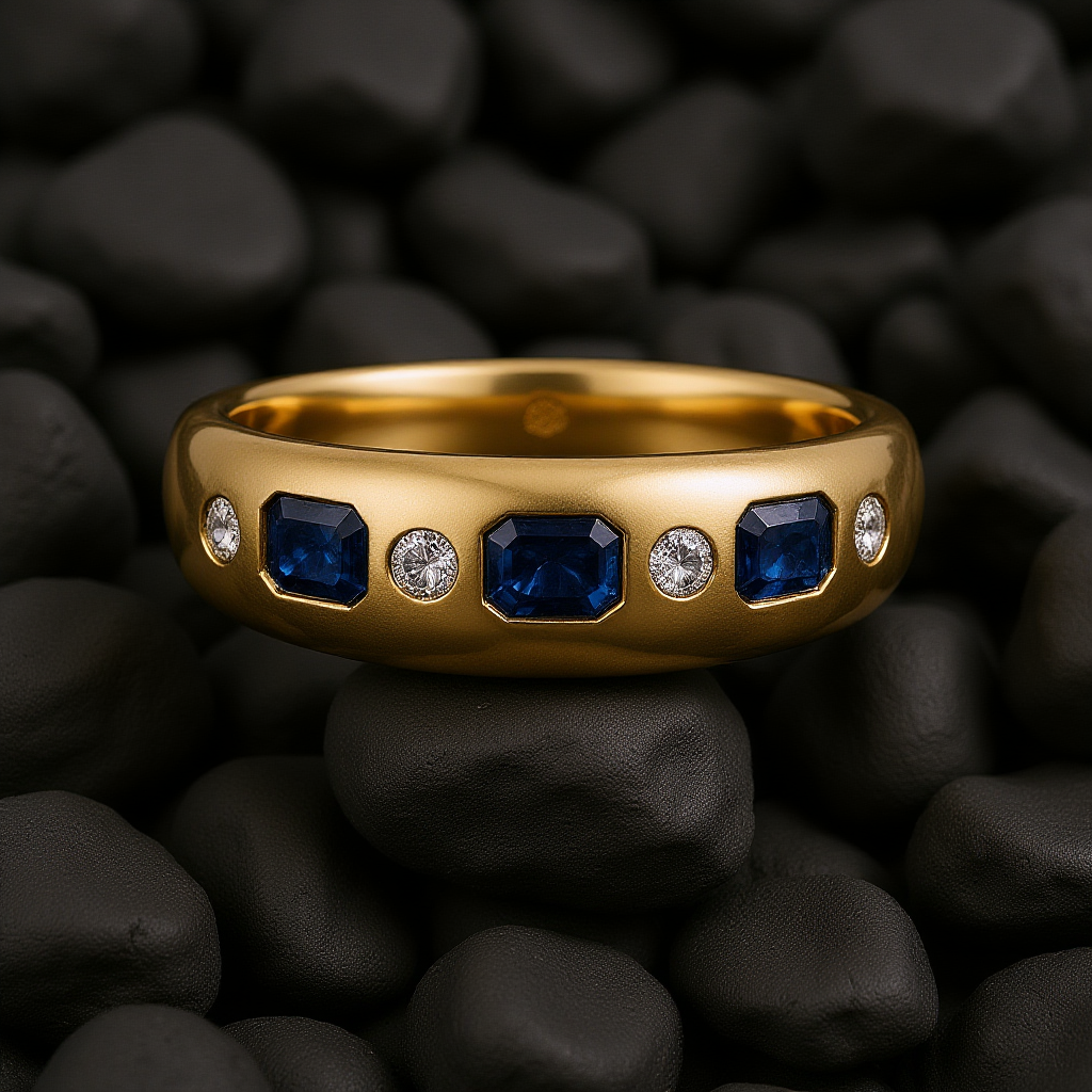 Timeless elegance meets contemporary craftsmanship in this exquisite Emerald-Cut Blue Sapphire & Diamond Band Ring, masterfully set in solid 14K yellow gold. The design features alternating emerald-cut royal blue sapphires and brilliant round white diamonds, each meticulously bezel-set into a polished gold band for a sleek, modern look.
