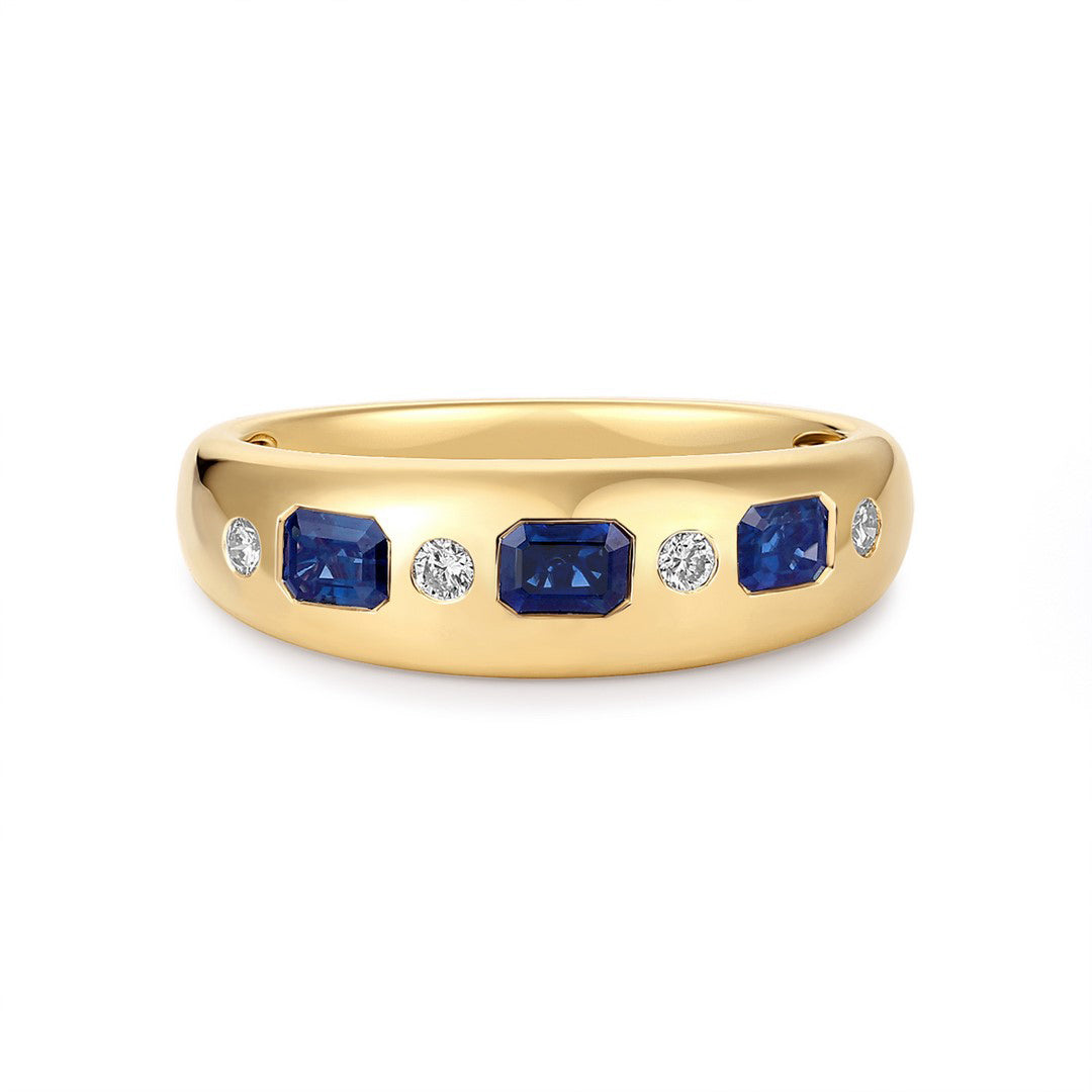 Emerald-Cut 14K (or 18k upon request) Yellow Gold Blue Sapphire Diamond Band Ring