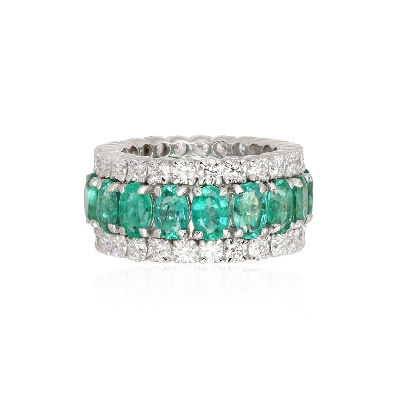 The Emerald Diamond 14K Yellow Gold Triple Row Eternity Band Ring is a breathtaking piece that showcases the perfect harmony of diamonds and emeralds. Crafted from 14K yellow gold, this stunning eternity band features 3.45 CT of fancy color diamonds and 6.91 CT of vibrant emeralds, creating a dazzling, elegant look. The combination of diamonds and emeralds adds an enchanting, radiant glow, making this ring a perfect symbol of lasting love and beauty.