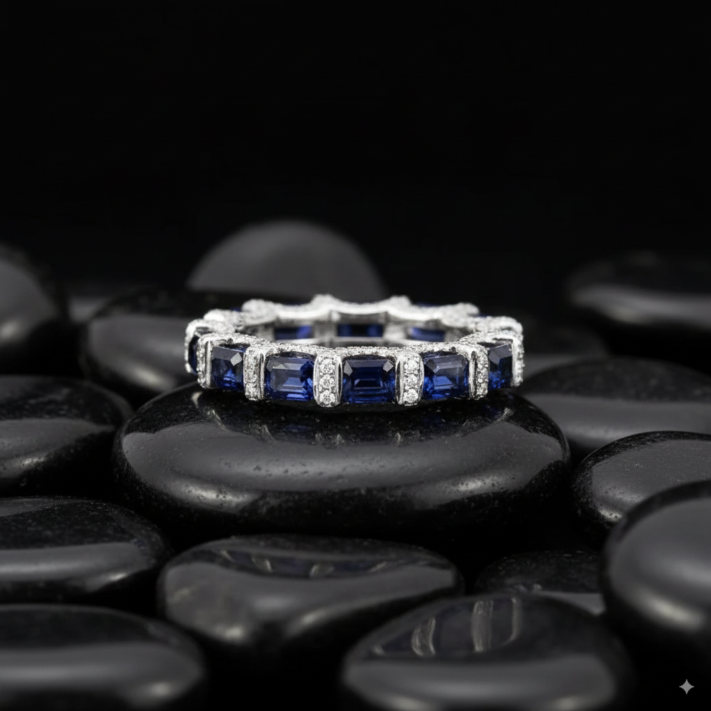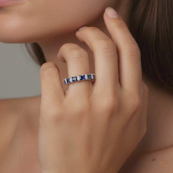 Eternity Band 14K (or 18k upon request) White Gold Blue Sapphire Diamond Ring
