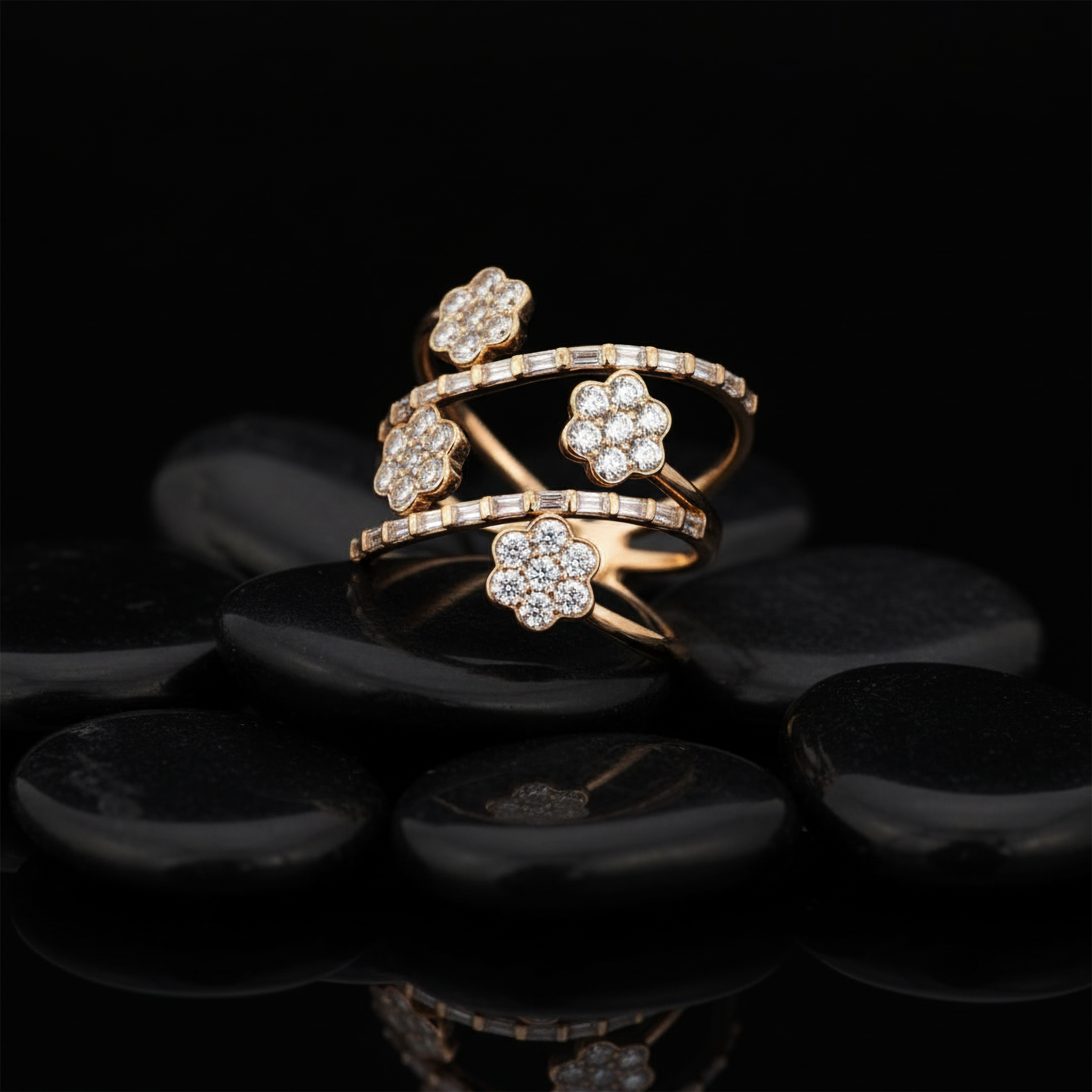 Floral Band 14K (or 18k upon request) Yellow Gold Multi Row Diamond Flower Ring