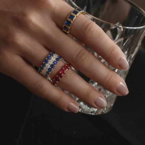 Radiant and refined, the Royal Blue Emerald-Cut Sapphire Eternity Band Ring is a timeless symbol of elegance and devotion. Handcrafted in solid 14K yellow gold, it features a continuous circle of emerald-cut royal blue sapphires, each meticulously set in a sleek, open-gallery bezel to allow light to dance through every facet.
