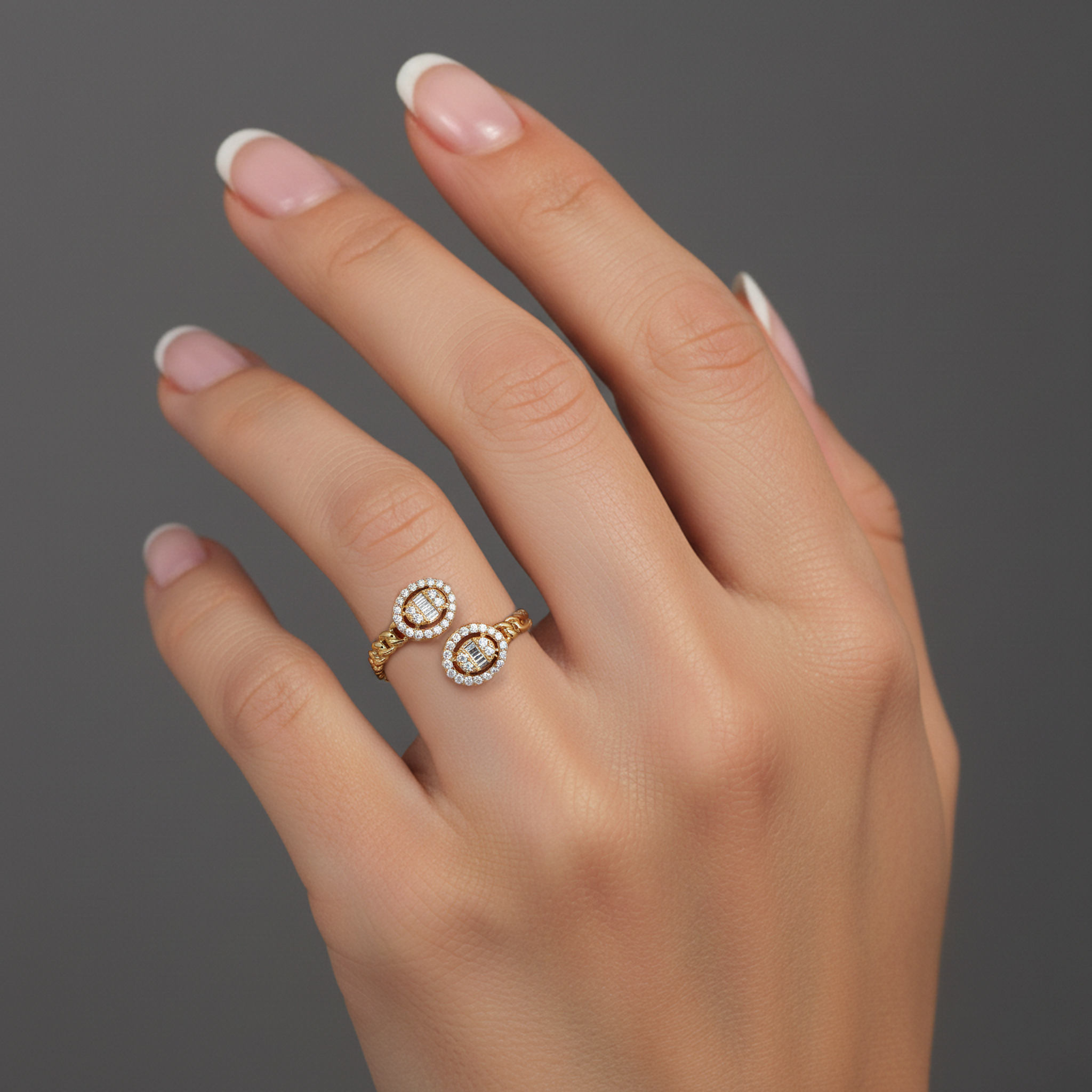 The Twist Ring 14K Yellow Gold Rope Band Ring is a stunning blend of elegance and modern design. Crafted in a combination of 14K yellow and white gold, this ring features 0.25 carats of FCD diamonds and 0.05 carats of baguette diamonds, delicately arranged to create a sophisticated wrap effect. Weighing 3.87 grams, its sleek design and sparkling diamonds make it a timeless addition to any jewelry collection. Perfect for those seeking a blend of classic beauty and contemporary style.