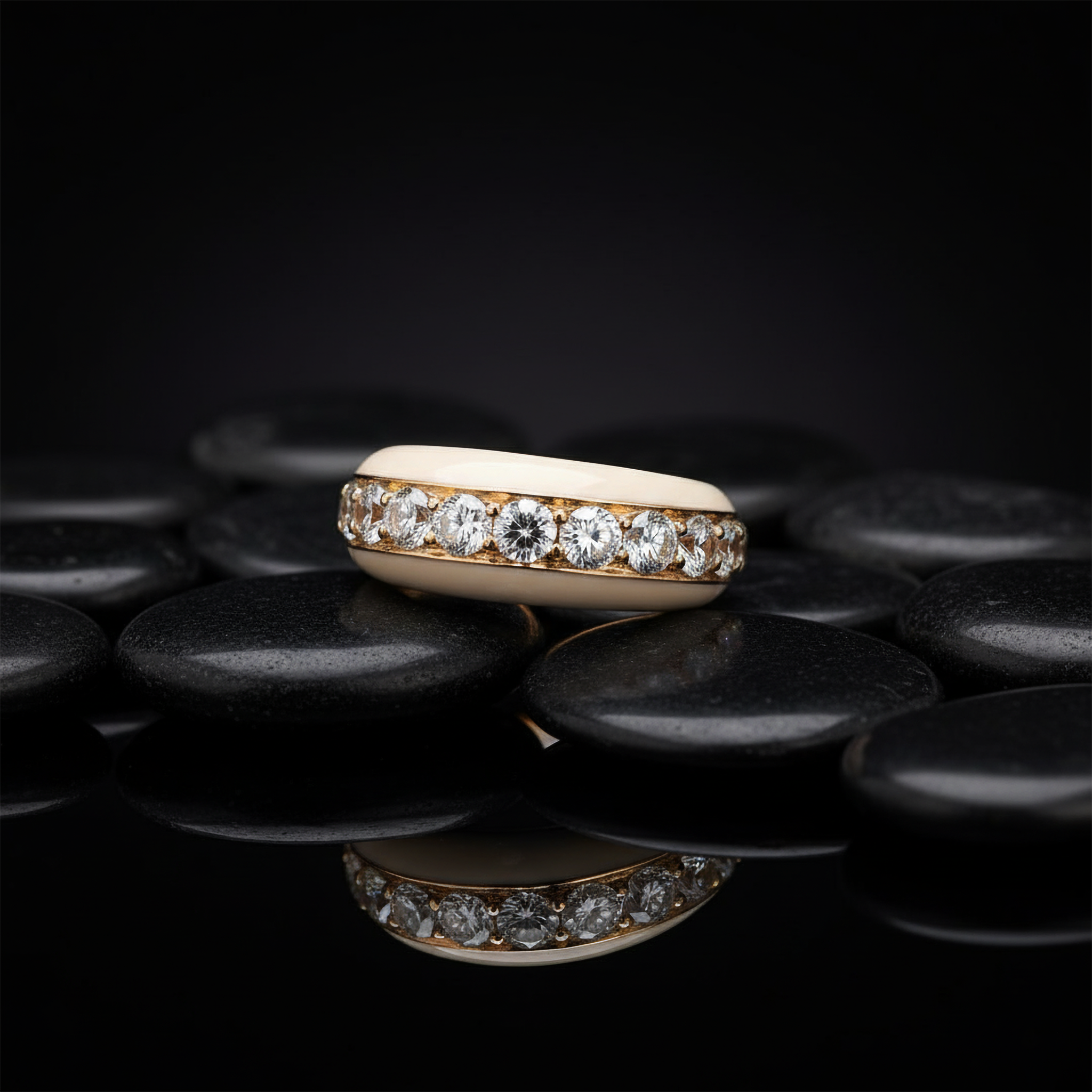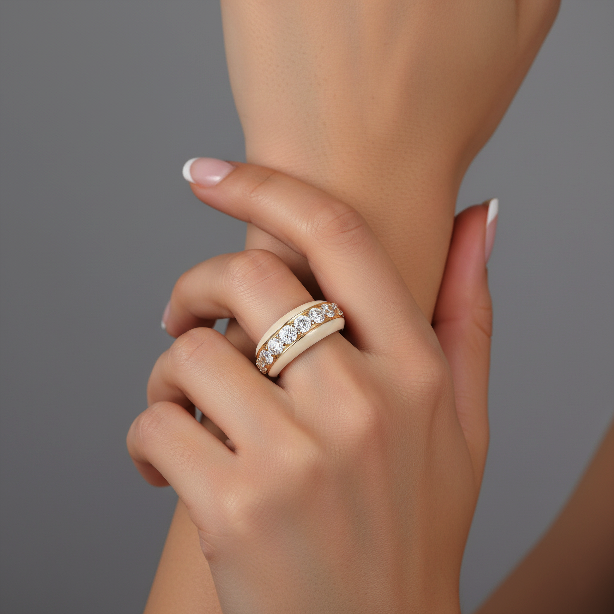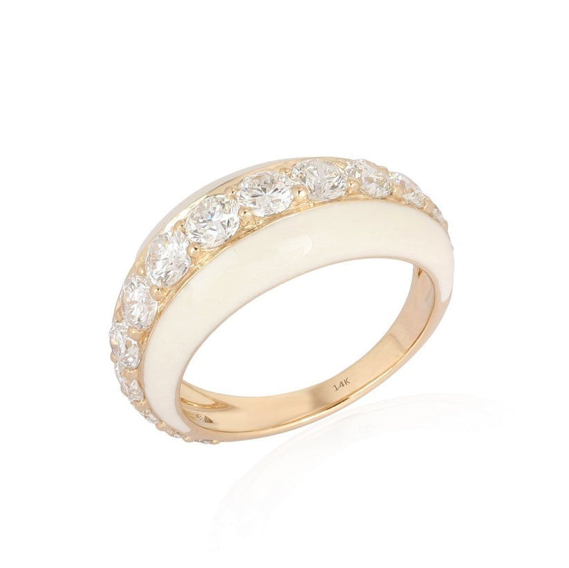 White Enamel Diamond 14K (or 18k upon request) Yellow Gold Band Ring
