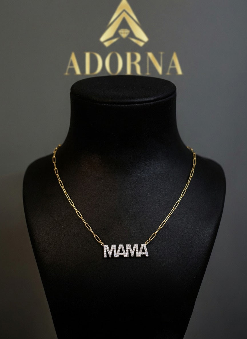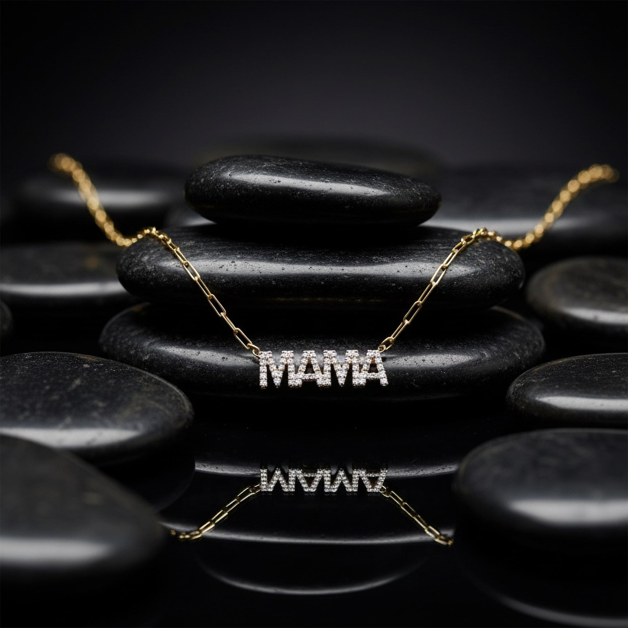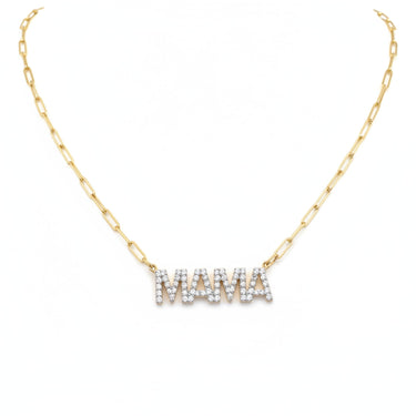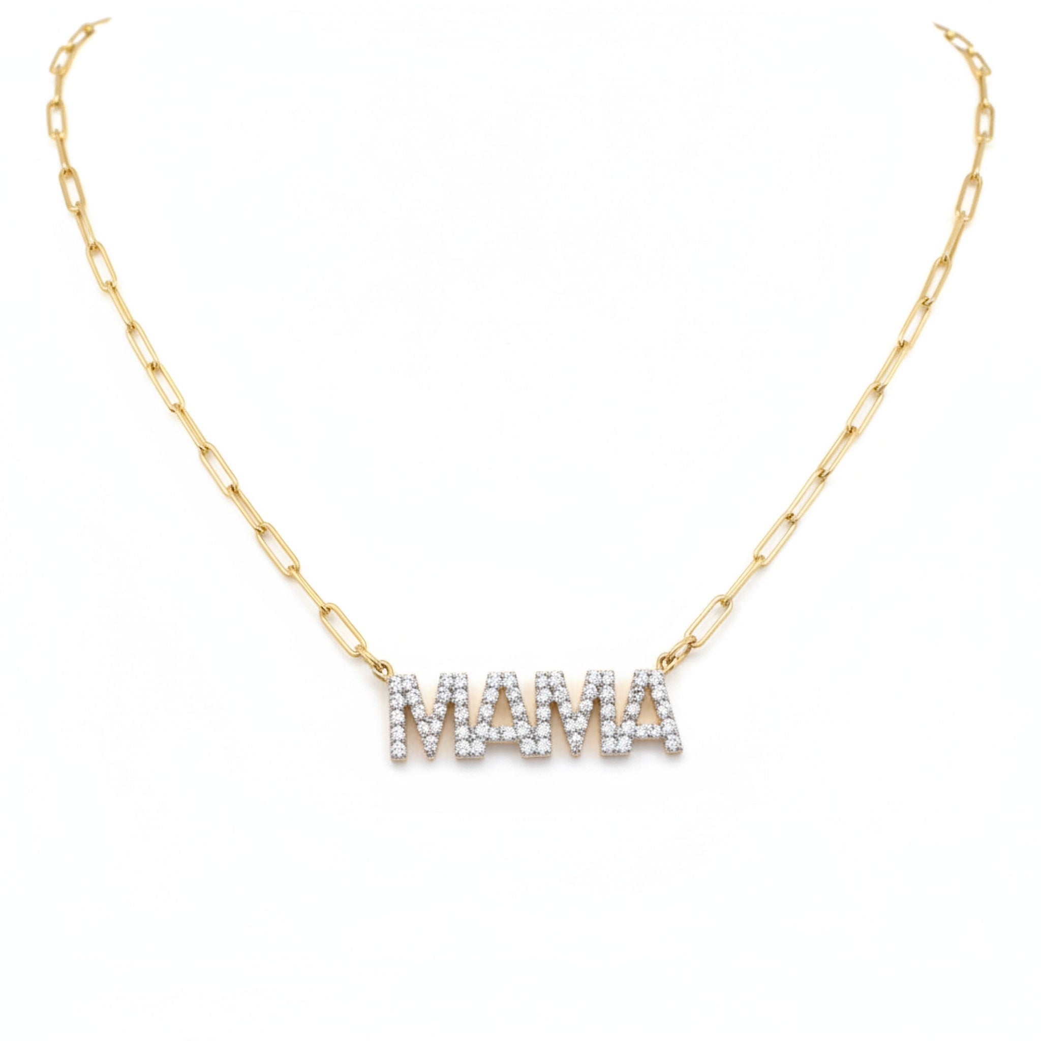 Celebrate love, strength, and motherhood with this dazzling Diamond “MAMA” Necklace, designed to make every mother shine. Crafted in solid 14K yellow gold (available in 18K upon request), the piece features bold, block-style letters spelling “MAMA,” each letter meticulously pavé-set with brilliant round-cut diamonds for unmatched sparkle and radiance.
