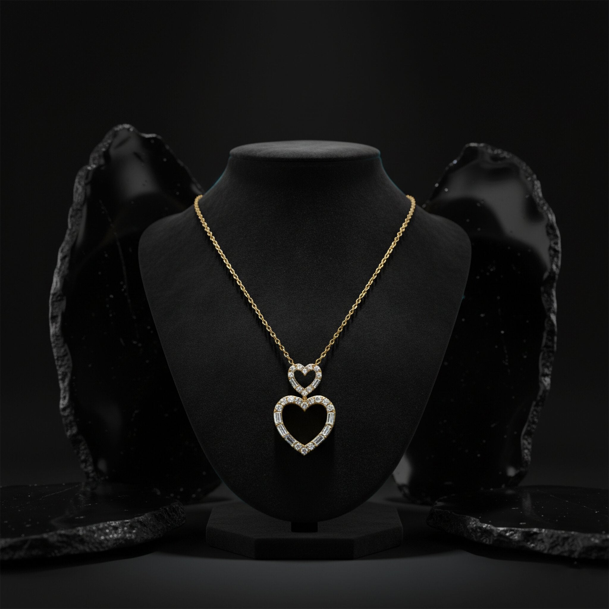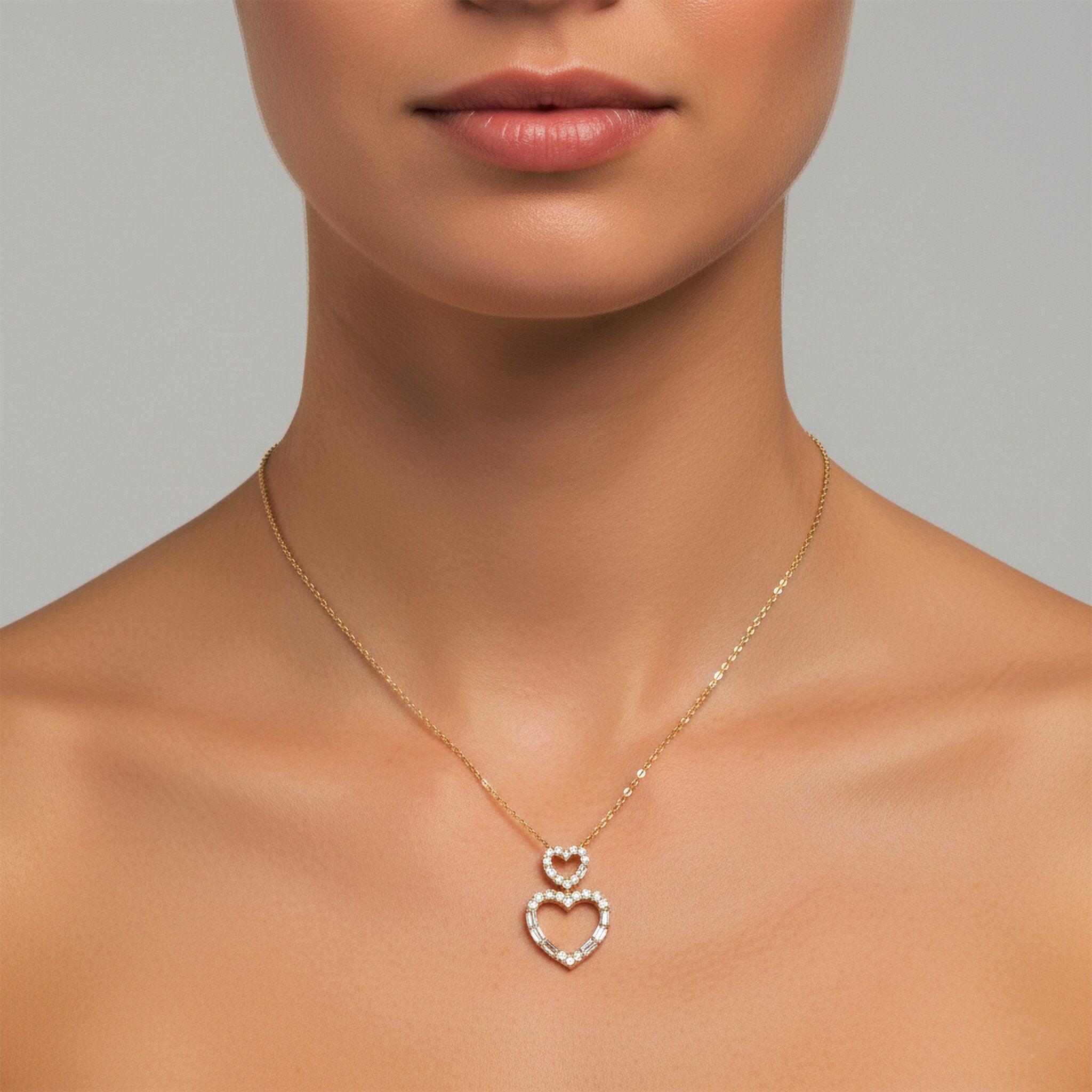 The Double Open Heart 14K Yellow Gold Diamond Pendant Necklace is a stunning piece that combines the timeless beauty of heart-shaped design with the elegance of baguette diamonds. Crafted in 14K yellow gold, this necklace exudes sophistication and luxury, making it an ideal choice for any romantic occasion or as a meaningful gift.