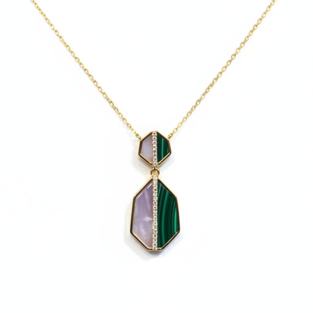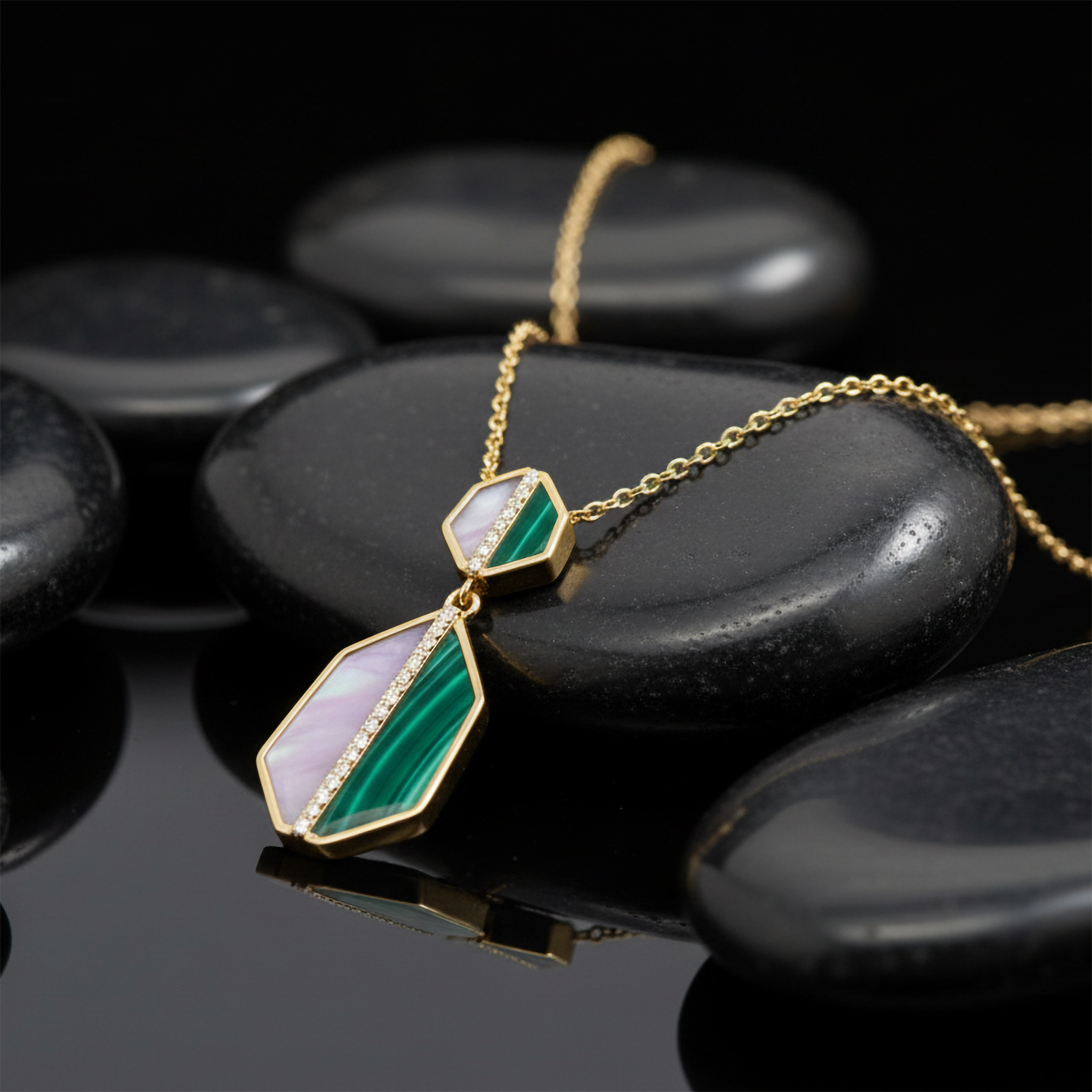 An exquisite harmony of color, texture, and light — this Malachite & Mother of Pearl Pendant Necklace is designed to make a modern statement with timeless grace. Handcrafted in solid 14K yellow gold (also available in 18K upon request), the pendant features two geometric shapes inlaid with vibrant green malachite and soft mother of pearl, divided by a delicate vertical line of pavé-set white diamonds.