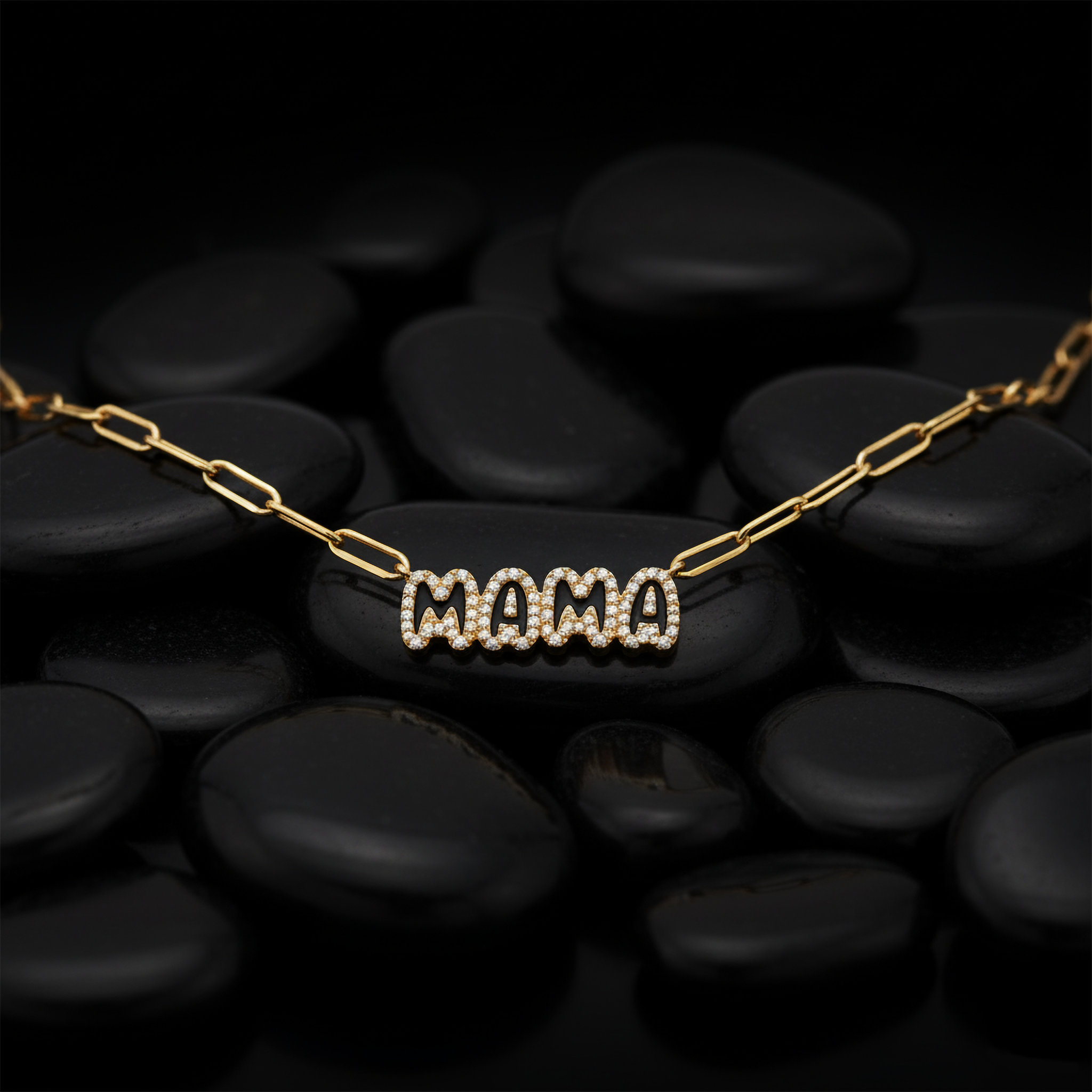 Celebrate motherhood with timeless elegance in this MAMA Letter Pendant Necklace, beautifully crafted in 14K white gold. The bold "MAMA" letters are adorned with shimmering round brilliant-cut diamonds, creating a sparkling statement of love and strength. The pendant hangs gracefully from a modern paperclip-style chain, offering a chic and contemporary look. Whether gifted to a new mom or worn as a daily reminder of family love, this necklace is both meaningful and stylish.