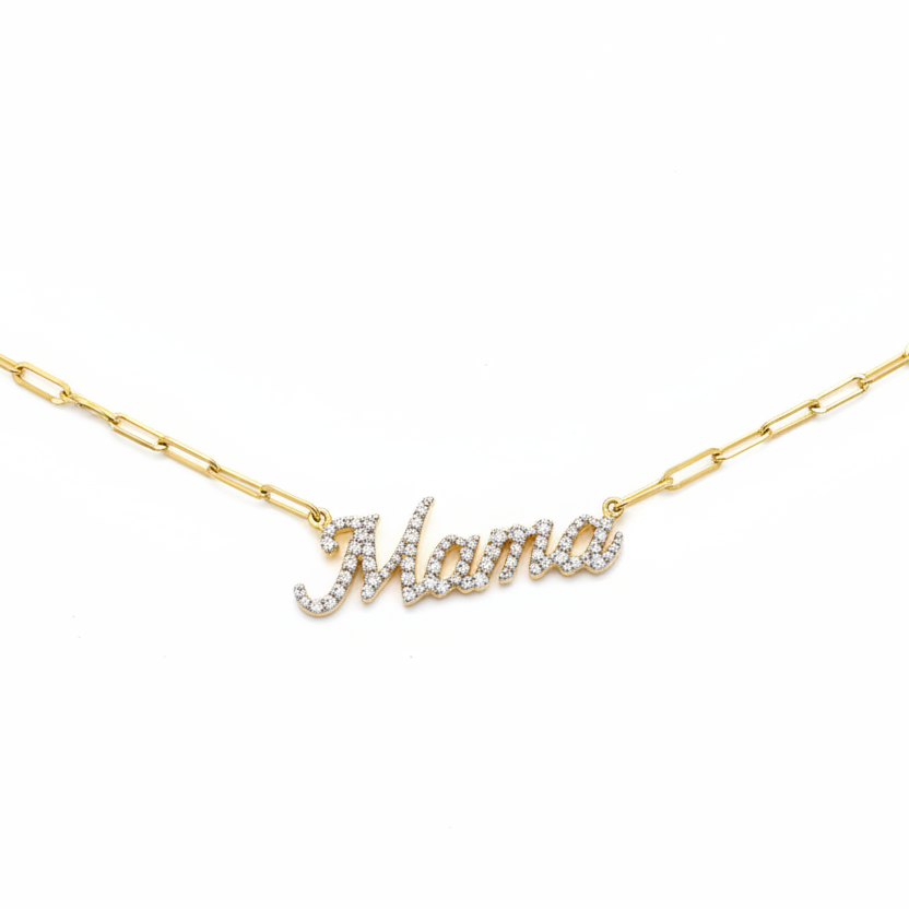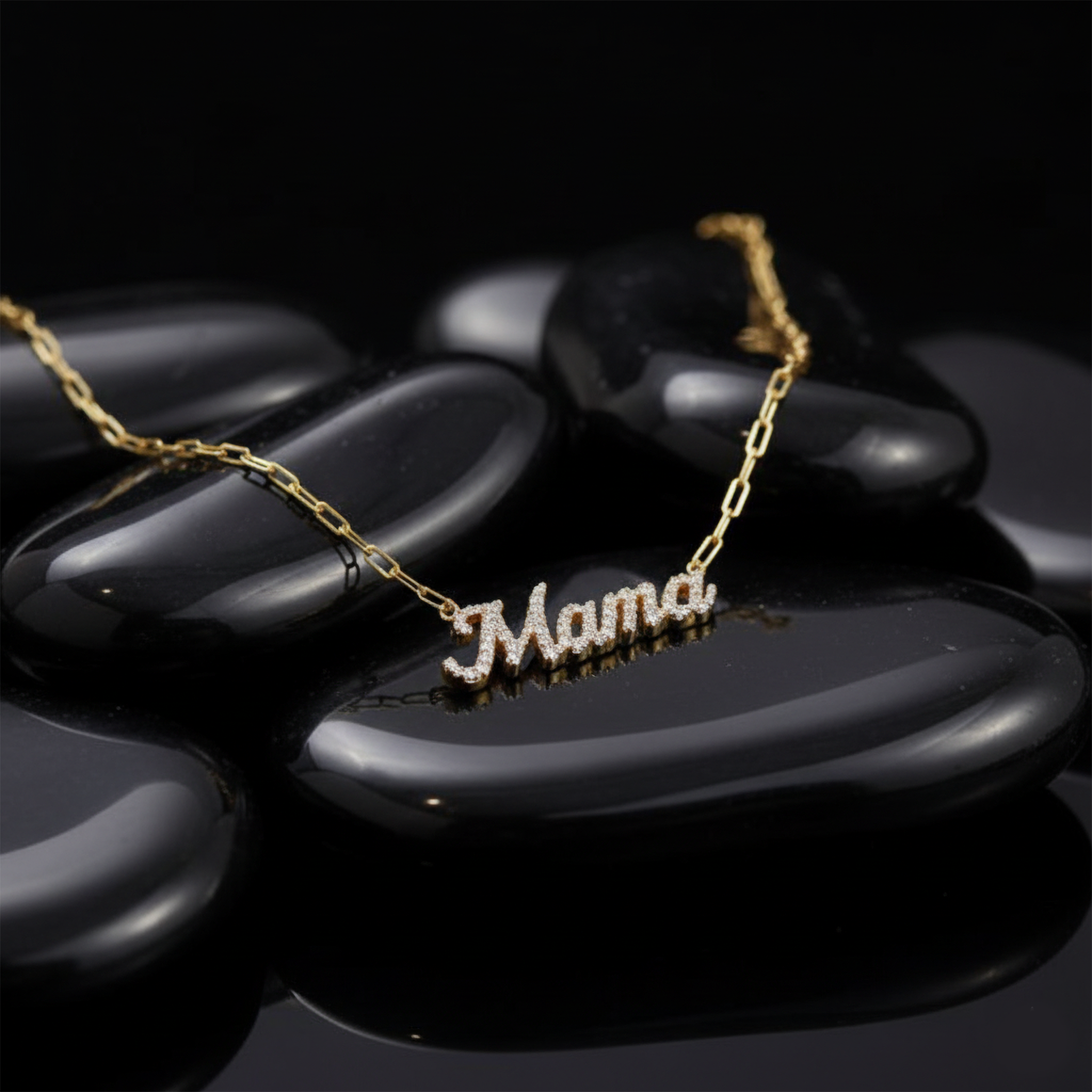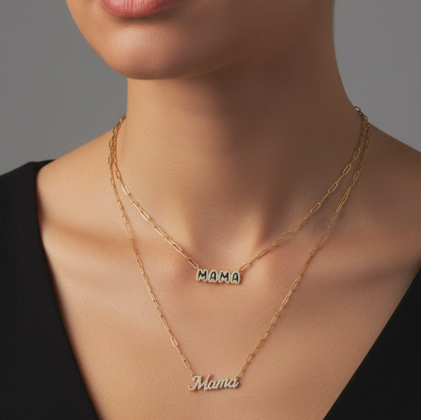 Celebrate the heart of motherhood with our Mama Necklace, a delicate yet luxurious piece crafted to shimmer with meaning. The elegant cursive “Mama” pendant sparkles with hand-set stones, suspended from a stylish paperclip link chain. Designed for daily wear or special occasions, this necklace captures love, warmth, and sophistication all in one timeless design.