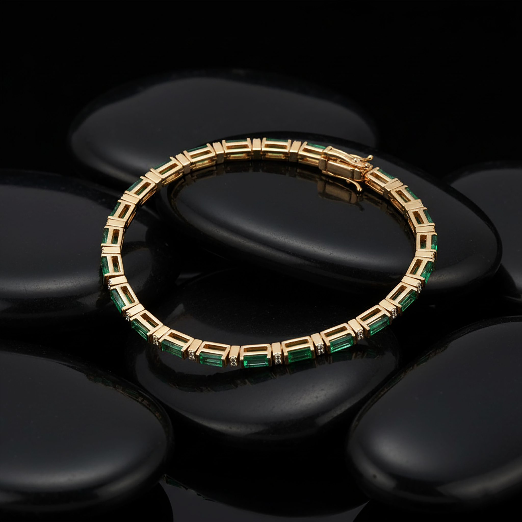 Green Gemstones 14K (or 18k upon request) Yellow Gold Diamond Tennis Bracelet