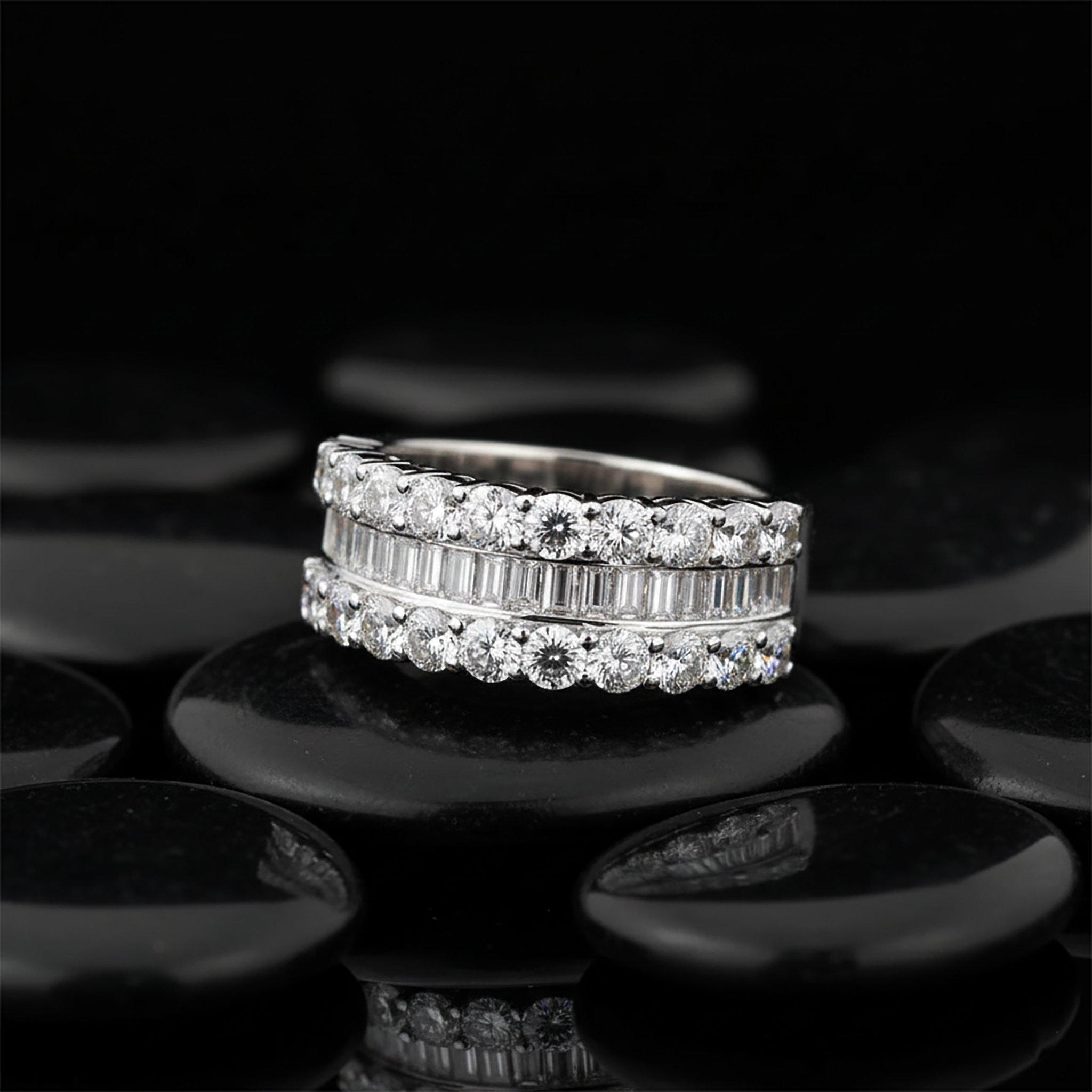 Double Row Round Baguette 14K (or 18k upon request) Gold Diamond Statement Ring