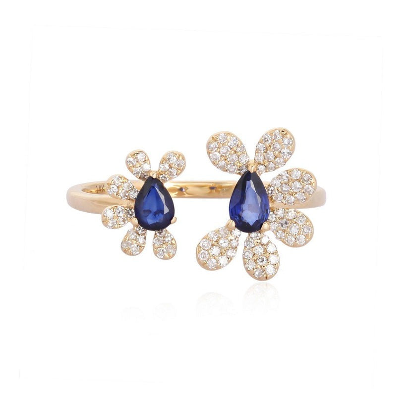 Dual Floral Teardrop 14K (or 18k upon request) Yellow Gold Sapphire Statement Ring
