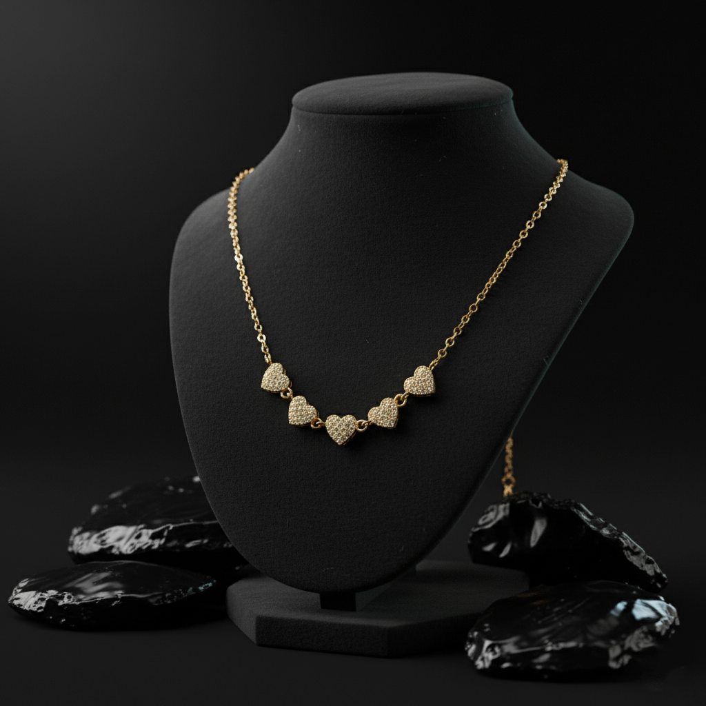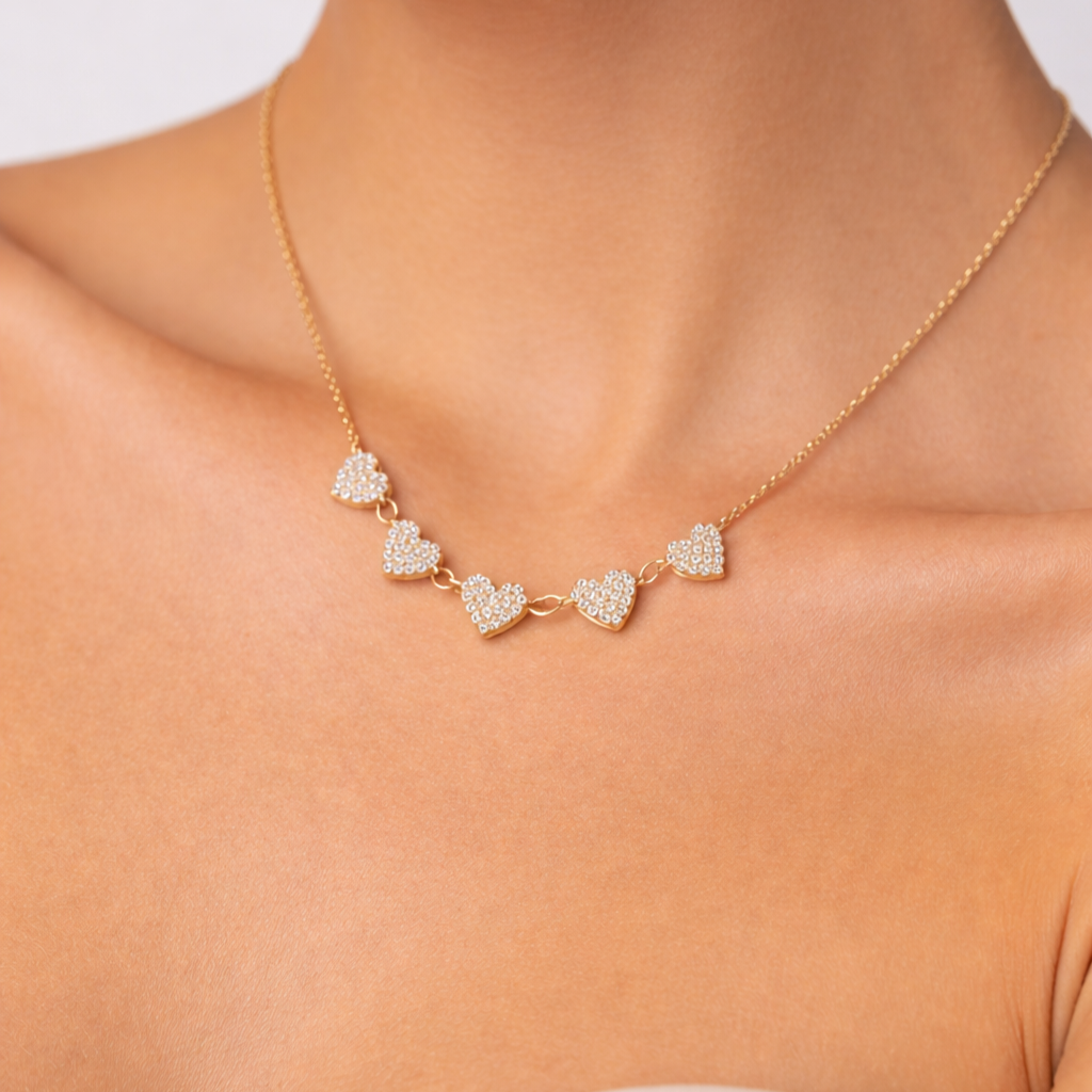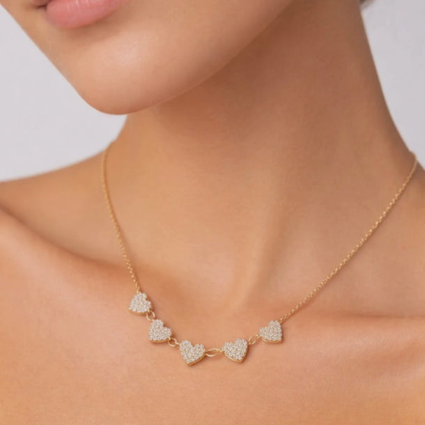 Five Pave Hearts 14K (or 18k upon request) Yellow Gold Diamond Necklace