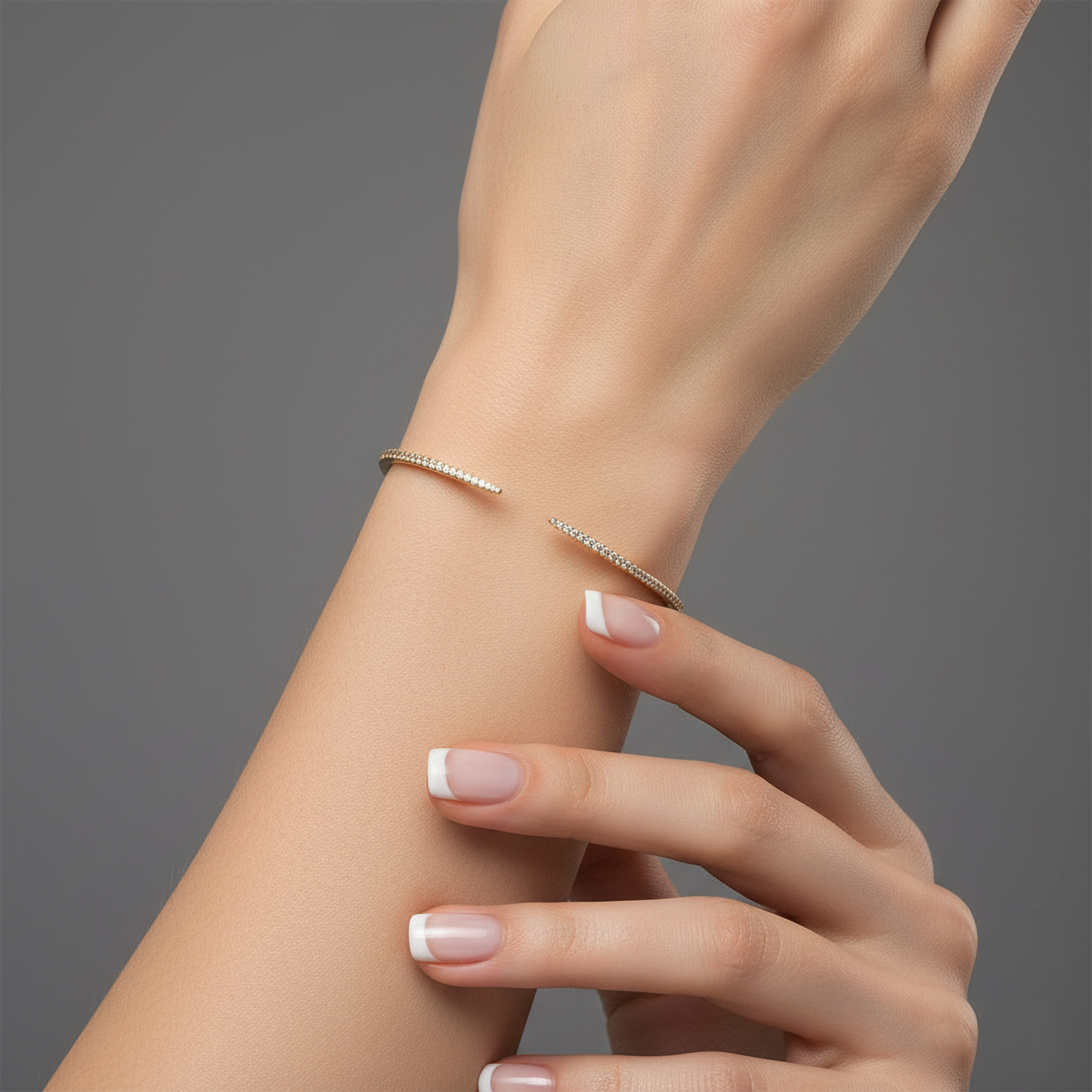 The Crystal Whisper 14K Yellow Gold Diamond Bangle Bracelet is crafted with natural diamonds, set in 14K gold. With a choice of yellow or rose gold, it offers a timeless appeal. The bracelet weighs 6 grams and features 0.50 carats of full-cut diamonds. Its delicate design radiates elegance, making it an ideal addition to any collection. Perfect for those who appreciate understated luxury.